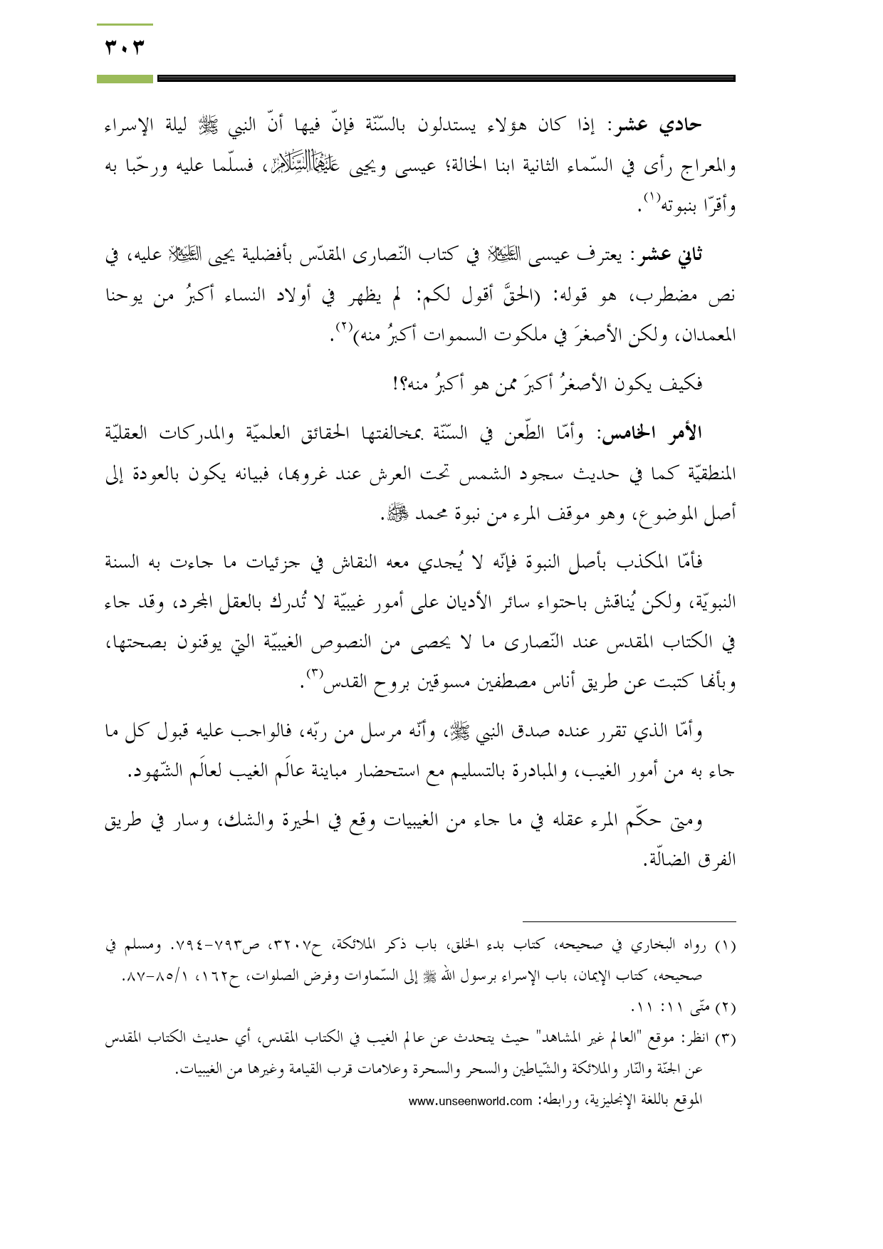 حادي عشر: إذا كان هؤلاء يستدلون بالسّنّة فإنّ فيها أنّ النبي - صلى الله عليه وسلم - ليلة الإسراء والمعراج رأى في السّماء الثانية ابنا الخالة؛ عيسى ويحيى ^، فسلّما عليه ورحّبا به وأقرّا بنبوته (¬2).