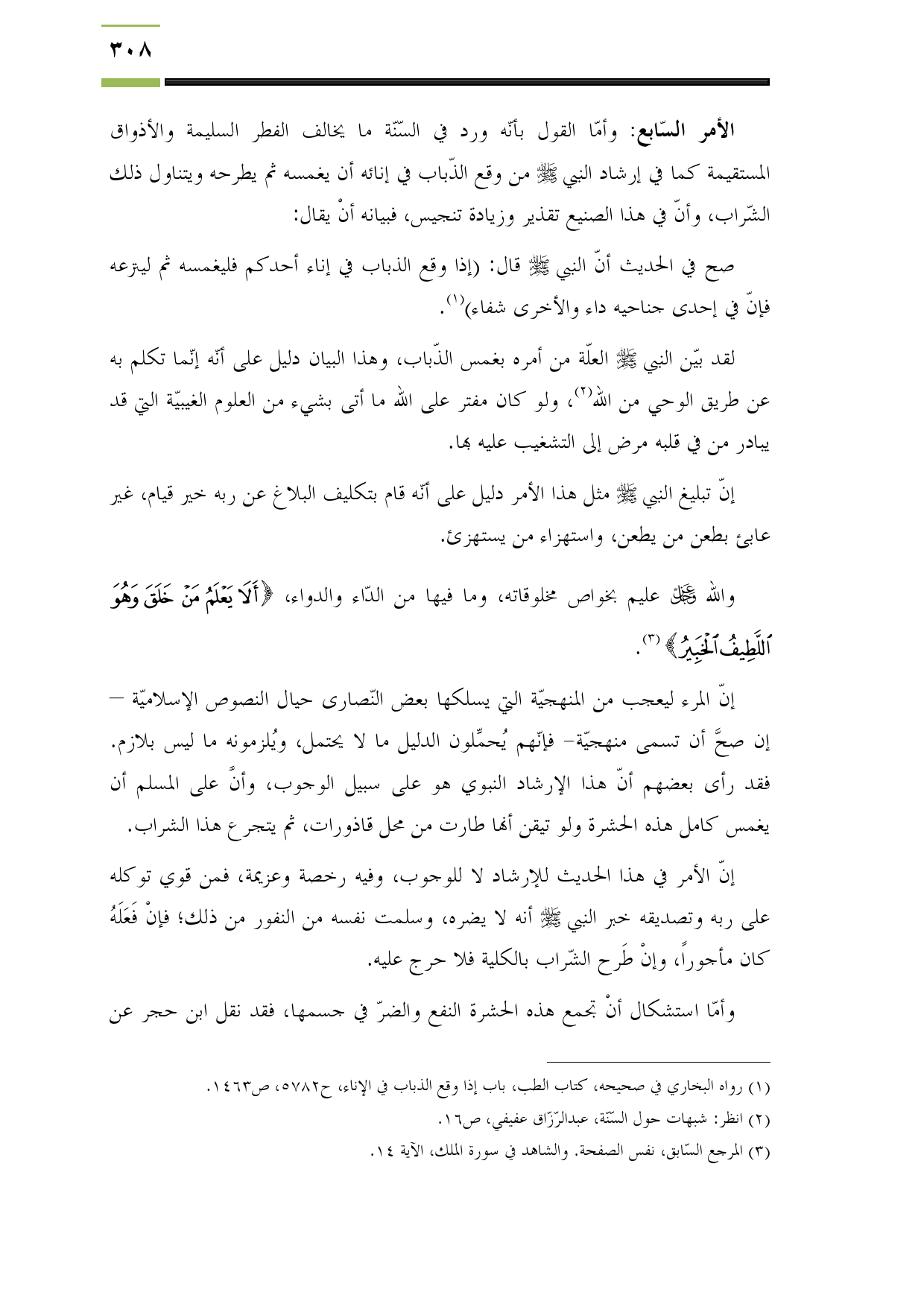 الأمر السّابع: وأمّا القول بأنّه ورد في السّنّة ما يخالف الفطر السليمة والأذواق المستقيمة كما في إرشاد النبي - صلى الله عليه وسلم - من وقع الذّباب في إنائه أن يغمسه ثم يطرحه ويتناول ذلك الشّراب، وأنّ في هذا الصنيع تقذير وزيادة تنجيس، فبيانه أنْ يقال: