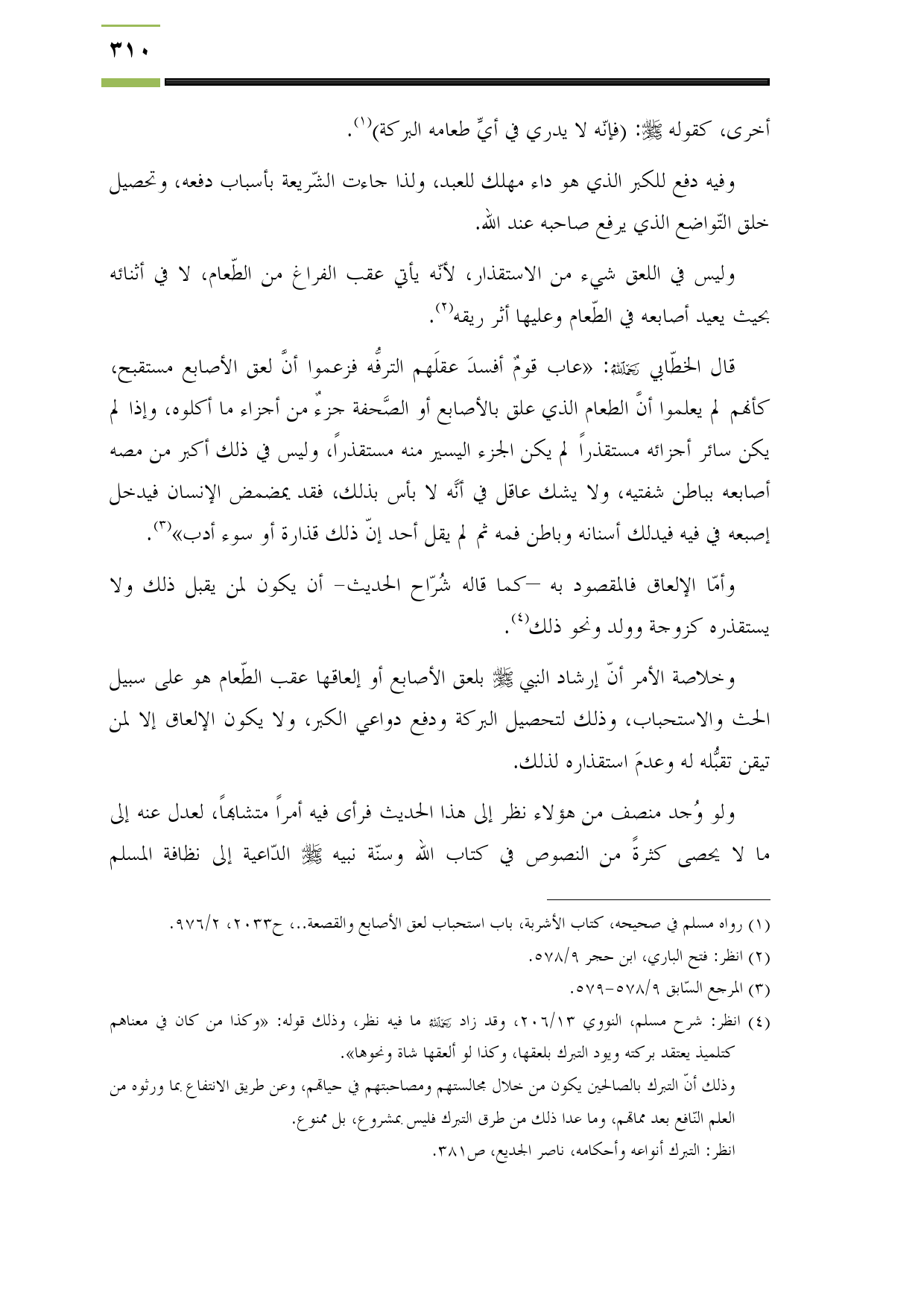 وليس في اللعق شيء من الاستقذار، لأنّه يأتي عقب الفراغ من الطّعام، لا في أثنائه بحيث يعيد أصابعه في الطّعام وعليها أثر ريقه (¬3).