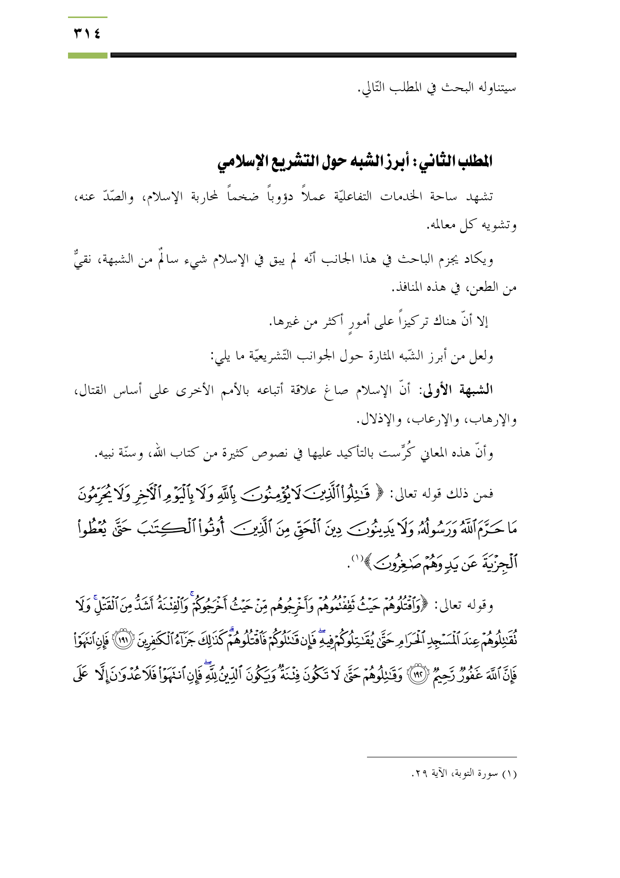 الشبهة الأولى: أنّ الإسلام صاغ علاقة أتباعه بالأمم الأخرى على أساس القتال، والإرهاب، والإرعاب، والإذلال.