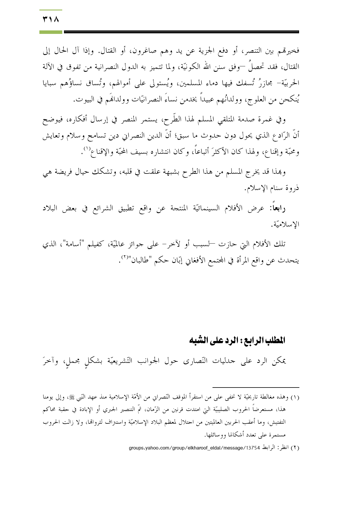 (¬1) وهذه مغالطة تاريخيّة لا تخفى على من استقرأ الموقف النّصراني من الأمّة الإسلامية منذ عهد النّبي - صلى الله عليه وسلم -، وإلى يومنا هذا، مستعرضاً الحروب الصليبيّة التي امتدت قرنين من الزّمان، ثمّ التنصير الجبري أو الإبادة في حقبة محاكم التفتيش، وما أعقب الحربين العالميتين من احتلال لمعظم البلاد الإسلاميّة واستنزاف لثرواتها، ولا زالت الحروب مستمرة على تعدد أشكالها ووسائلها.