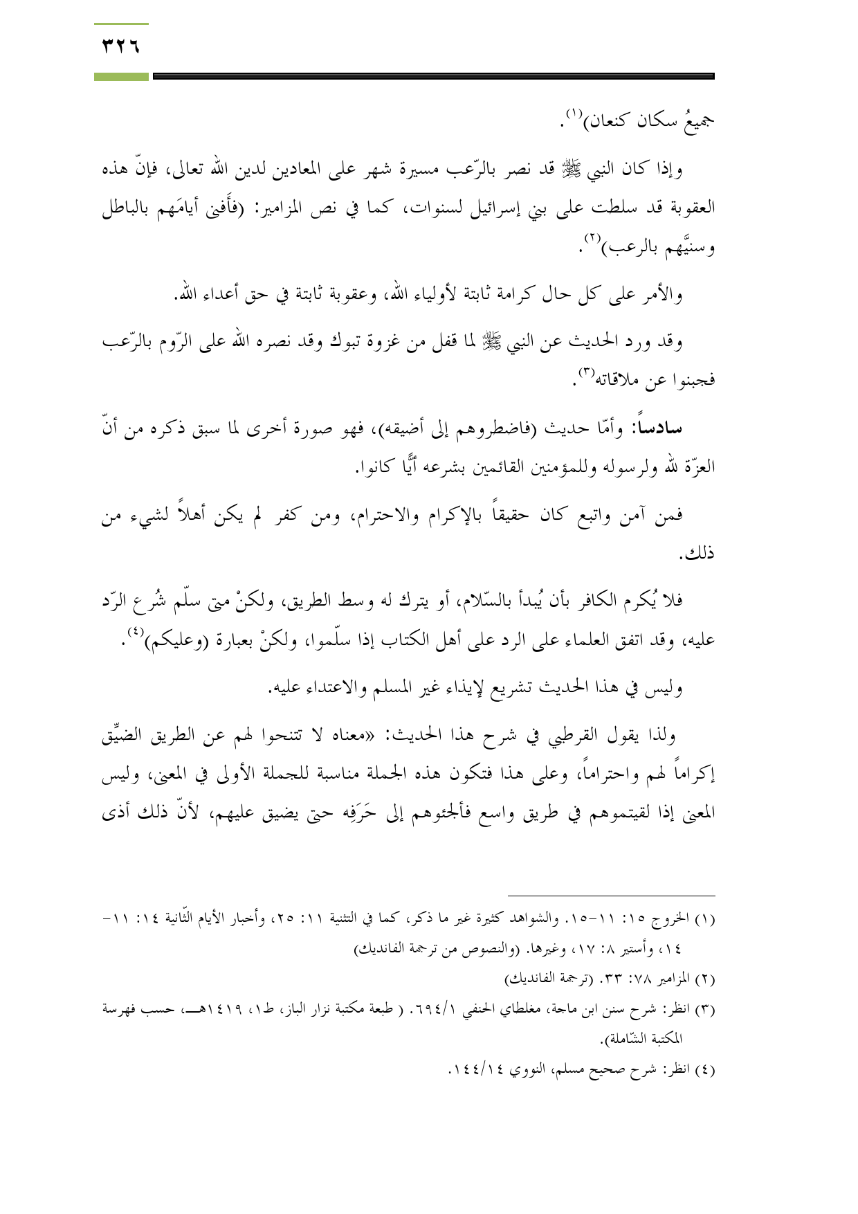 ولذا يقول القرطبي في شرح هذا الحديث: «معناه لا تتنحوا لهم عن الطريق الضيِّق إكراماً لهم واحتراماً، وعلى هذا فتكون هذه الجملة مناسبة للجملة الأولى في المعنى، وليس المعنى إذا لقيتموهم في طريق واسع فألجئوهم إلى حَرَفِه حتى يضيق عليهم، لأنّ ذلك أذى