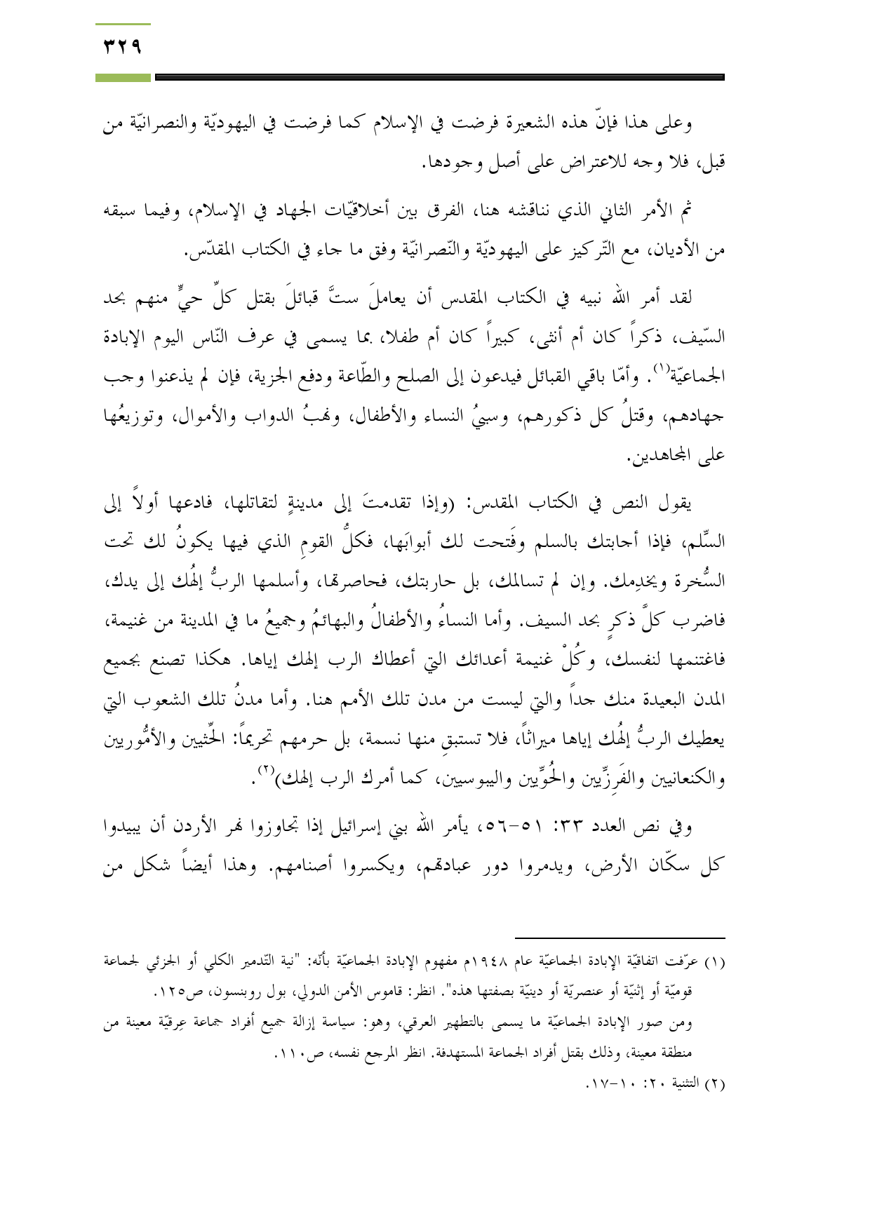 (¬1) عرّفت اتفاقيّة الإبادة الجماعيّة عام 1948م مفهوم الإبادة الجماعيّة بأنّه: "نية التّدمير الكلي أو الجزئي لجماعة قوميّة أو إثنيّة أو عنصريّة أو دينيّة بصفتها هذه". انظر: قاموس الأمن الدولي، بول روبنسون، ص125.