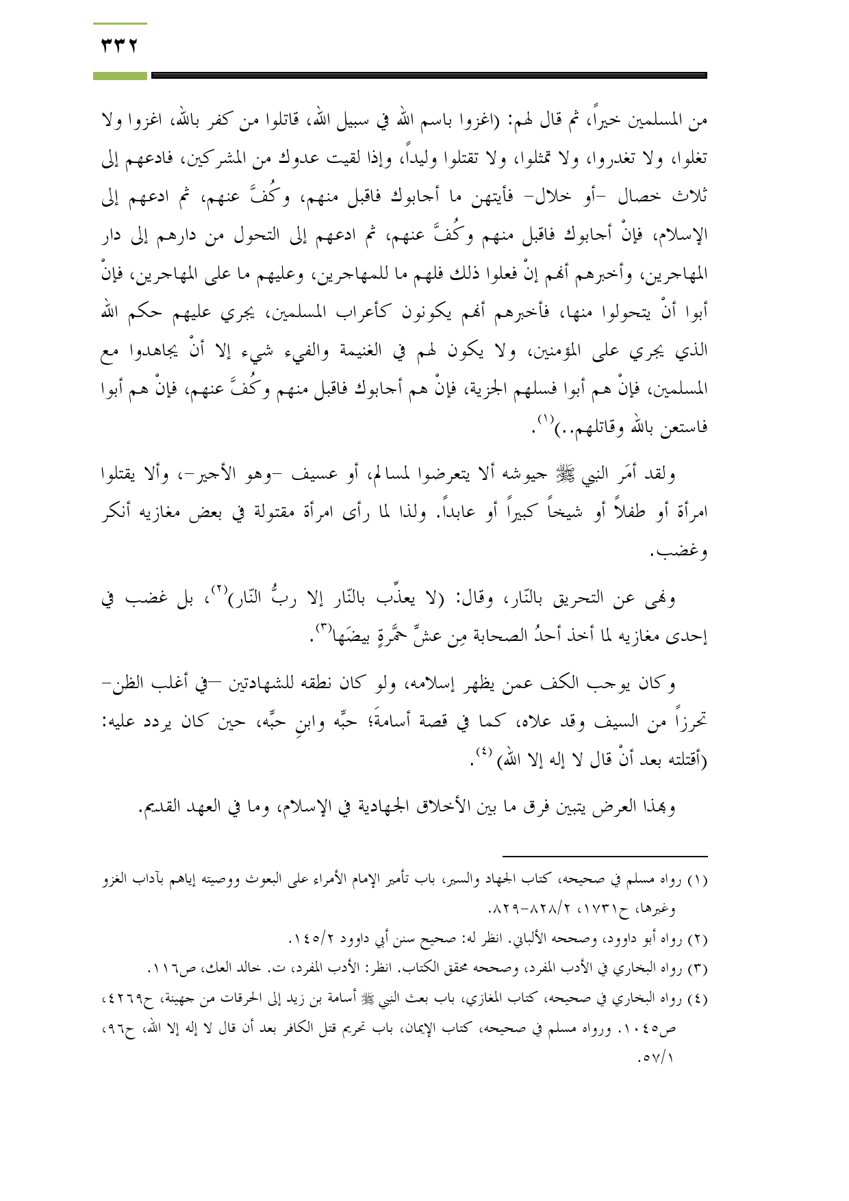 (¬1) رواه مسلم في صحيحه، كتاب الجهاد والسير، باب تأمير الإمام الأمراء على البعوث ووصيته إياهم بآداب الغزو وغيرها، ح1731، 2/ 828 - 829.