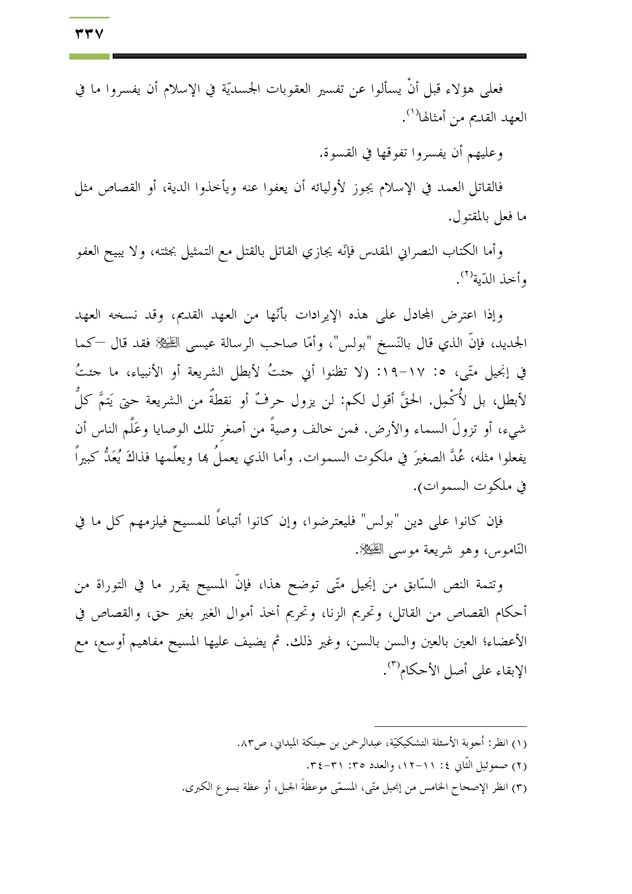 وإذا اعترض المجادل على هذه الإيرادات بأنّها من العهد القديم، وقد نسخه العهد الجديد، فإنّ الذي قال بالنّسخ "بولس"، وأمّا صاحب الرسالة عيسى - عليه السلام - فقد قال -كما في إنجيل متّى، 5: 17 - 19: (لا تظنوا أني جئتُ لأبطل الشريعة أو الأنبياء، ما جئتُ لأبطل، بل لأُكْمِل. الحقَّ أقول لكم: لن يزول حرفٌ أو نقطةٌ من الشريعة حتى يَتمَّ كلُّ شيء، أو تزولَ السماء والأرض. فمن خالف وصيةً من أصغرِ تلك الوصايا وعَلَّم الناس أن يفعلوا مثله، عُدَّ الصغيرَ في ملكوت السموات. وأما الذي يعملُ بها ويعلِّمها فذاكَ يُعَدُّ كبيراً في ملكوت السموات).
