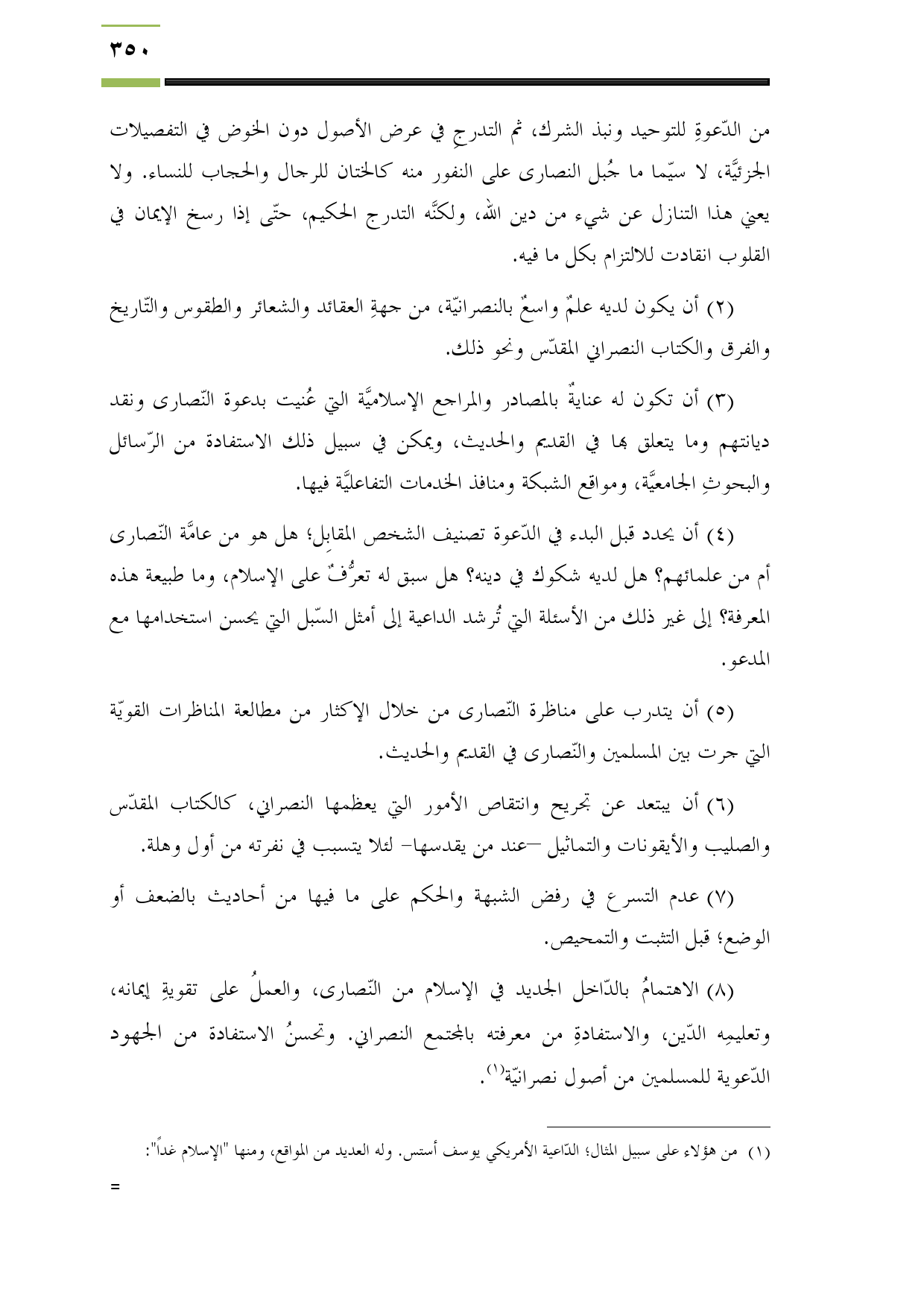 من الدّعوةِ للتوحيد ونبذ الشرك، ثم التدرجِ في عرض الأصول دون الخوض في التفصيلات الجزئيَّة، لا سيّما ما جُبل النصارى على النفور منه كالختان للرجال والحجاب للنساء. ولا يعني هذا التنازل عن شيء من دين الله، ولكنَّه التدرج الحكيم، حتّى إذا رسخ الإيمان في القلوب انقادت للالتزام بكل ما فيه.