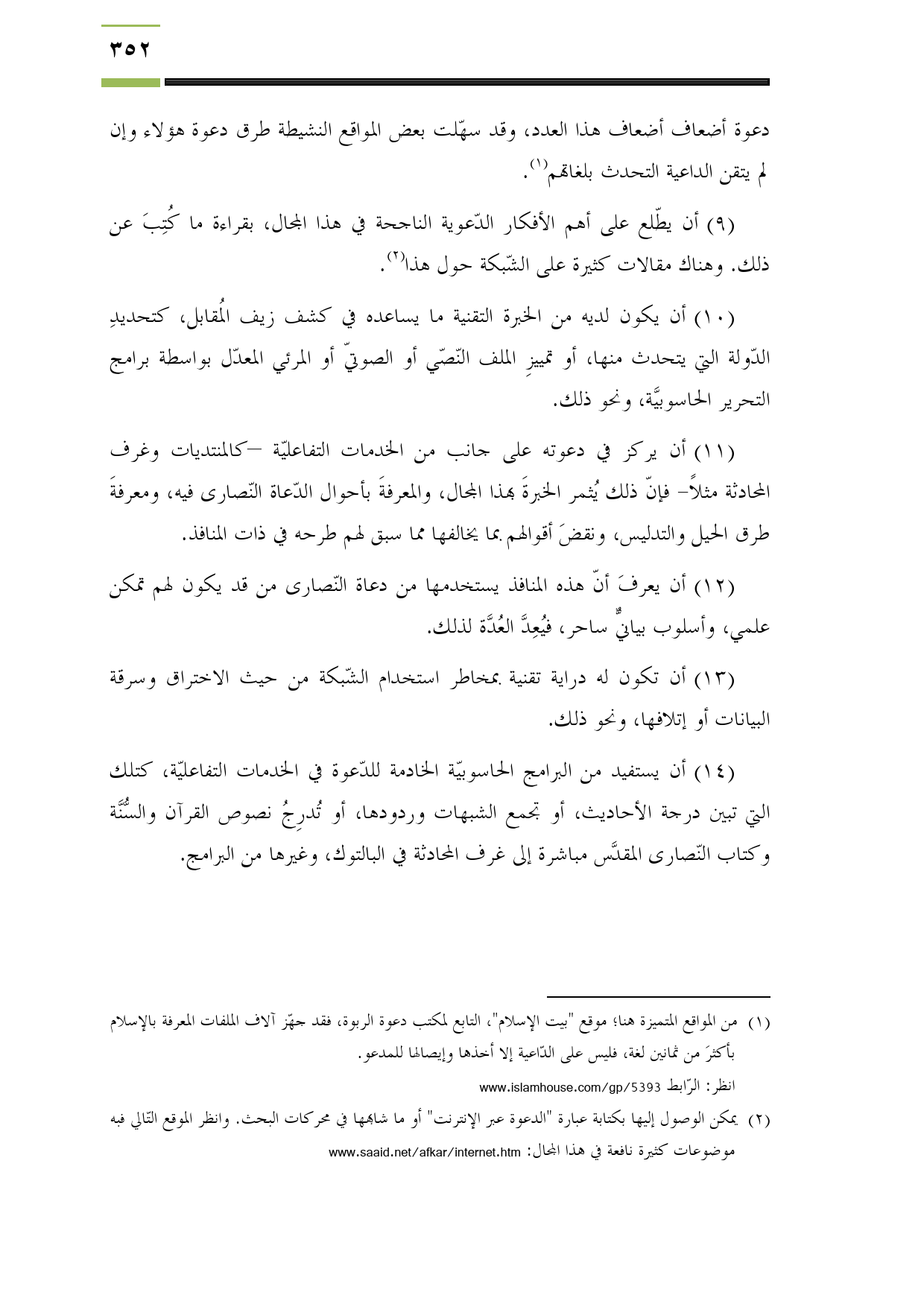(¬2) يمكن الوصول إليها بكتابة عبارة "الدعوة عبر الإنترنت" أو ما شابهها في محركات البحث. وانظر الموقع التّالي فبه موضوعات كثيرة نافعة في هذا المجال: www.saaid.net/afkar/internet.htm