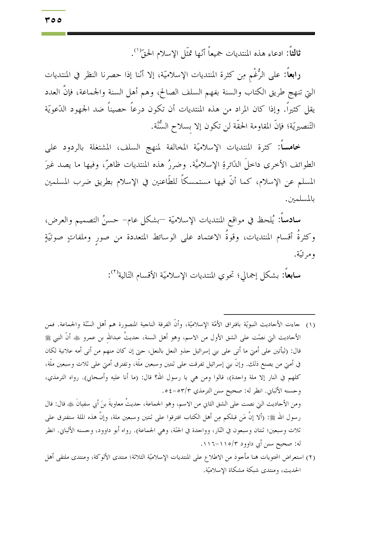 رابعاً: على الرُّغْمِ مِن كثرة المنتديات الإسلاميّة، إلا أنّنا إذا حصرنا النظر في المنتديات التي تنهج طريق الكتاب والسنة بفهم السلف الصالح، وهم أهل السنة والجماعة، فإنَّ العدد يقل كثيراً. وإذا كان المراد من هذه المنتديات أن تكون درعاً حصيناً ضد الجهود الدّعويّة التّنصيريّة؛ فإنّ المقاومة الحقّة لن تكون إلا بِسلاح السُّنَّة.