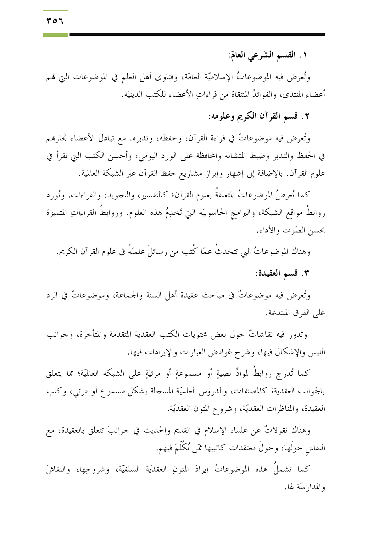 وتُعرض فيه الموضوعاتُ الإسلاميّة العامّة، وفتاوى أهل العلم في الموضوعات التي تهم أعضاء المنتدى، والفوائدُ المنتقاة من قراءاتِ الأعضاء للكتب الدينيّة.