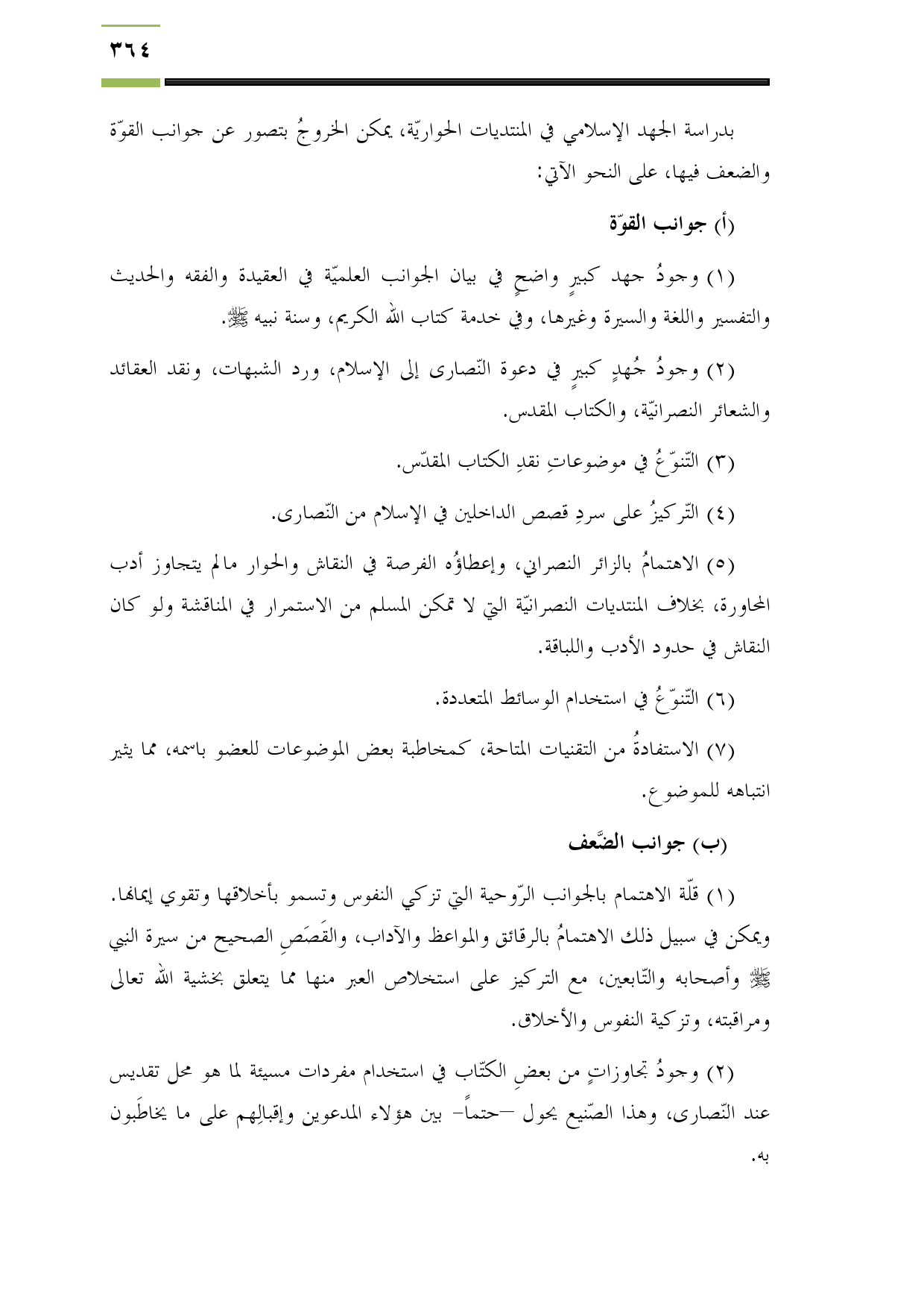 بدراسة الجهد الإسلامي في المنتديات الحواريّة، يمكن الخروجُ بتصور عن جوانب القوّة والضعف فيها، على النحو الآتي: