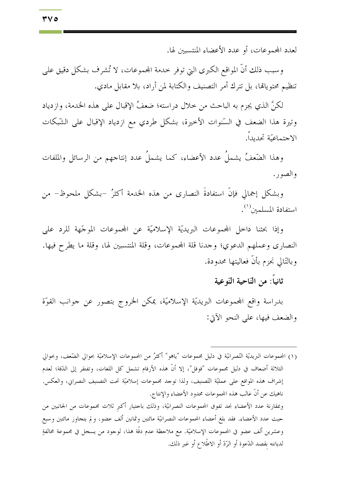 (¬1) المجموعات البريديّة النّصرانيّة في دليل مجموعات "ياهو" أكثرُ من المجموعات الإسلاميّة بحوالي الضّعف، وبحوالي الثلاثة أضعاف في دليل مجموعات "قوقل"، إلا أنّ هذه الأرقام تشمل كل اللغات، وتفتقر إلى الدّقة؛ لعدم إشراف هذه المواقع على عمليّة التّصنيف، ولذا توجد مجموعات إسلاميّة تحت التصنيف النصراني، والعكس. ناهيك عن أنّ غالب هذه المجموعات محدود الأعضاء والإنتاج.