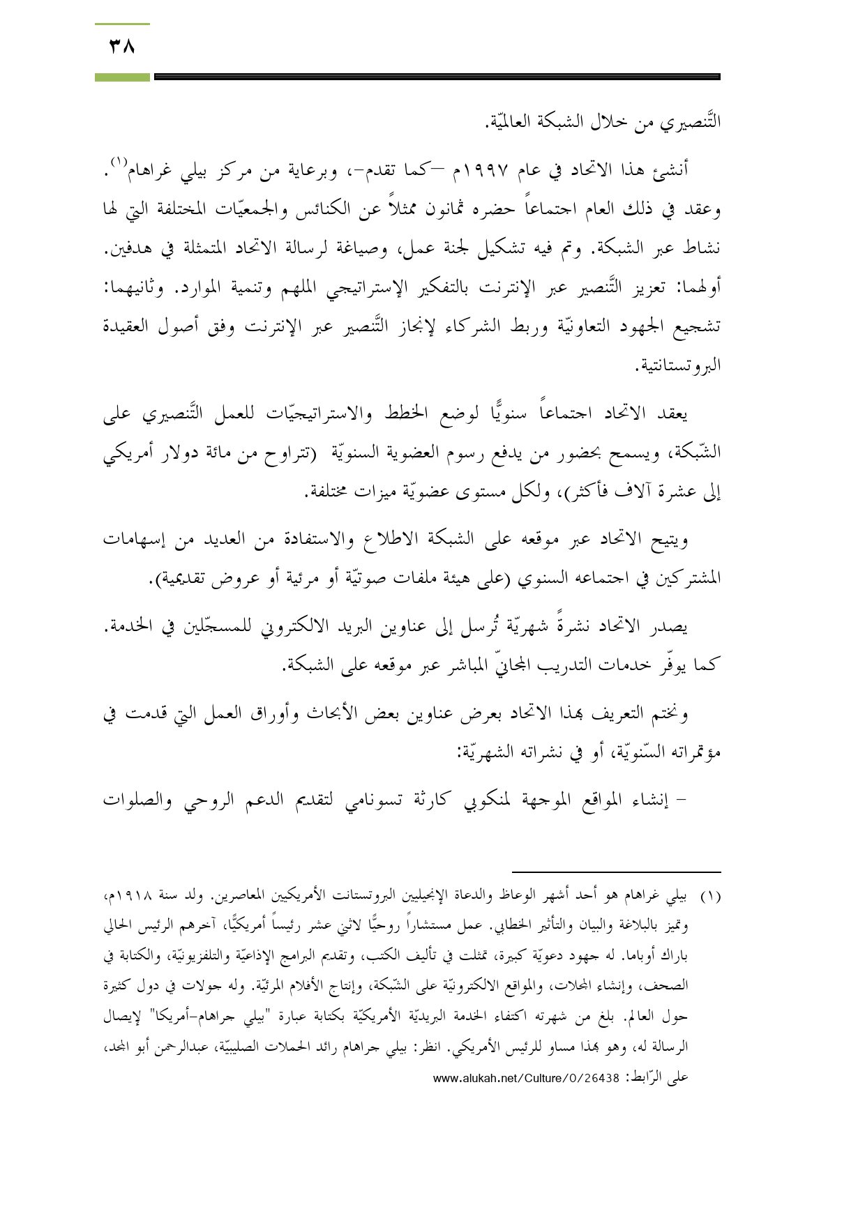 (¬1) بيلي غراهام هو أحد أشهر الوعاظ والدعاة الإنجيليين البروتستانت الأمريكيين المعاصرين. ولد سنة 1918م، وتميز بالبلاغة والبيان والتأثير الخطابي. عمل مستشاراً روحيًّا لاثني عشر رئيساً أمريكيًّا، آخرهم الرئيس الحالي باراك أوباما. له جهود دعويّة كبيرة، تمثلت في تأليف الكتب، وتقديم البرامج الإذاعيّة والتلفزيونيّة، والكتابة في الصحف، وإنشاء المجلات، والمواقع الالكترونيّة على الشّبكة، وإنتاج الأفلام المرئيّة. وله جولات في دول كثيرة حول العالم. بلغ من شهرته اكتفاء الخدمة البريديّة الأمريكيّة بكتابة عبارة "بيلي جراهام-أمريكا" لإيصال الرسالة له، وهو بهذا مساو للرئيس الأمريكي. انظر: بيلي جراهام رائد الحملات الصليبيّة، عبدالرحمن أبو المجد، على الرّابط: www.alukah.net/Culture/0/26438