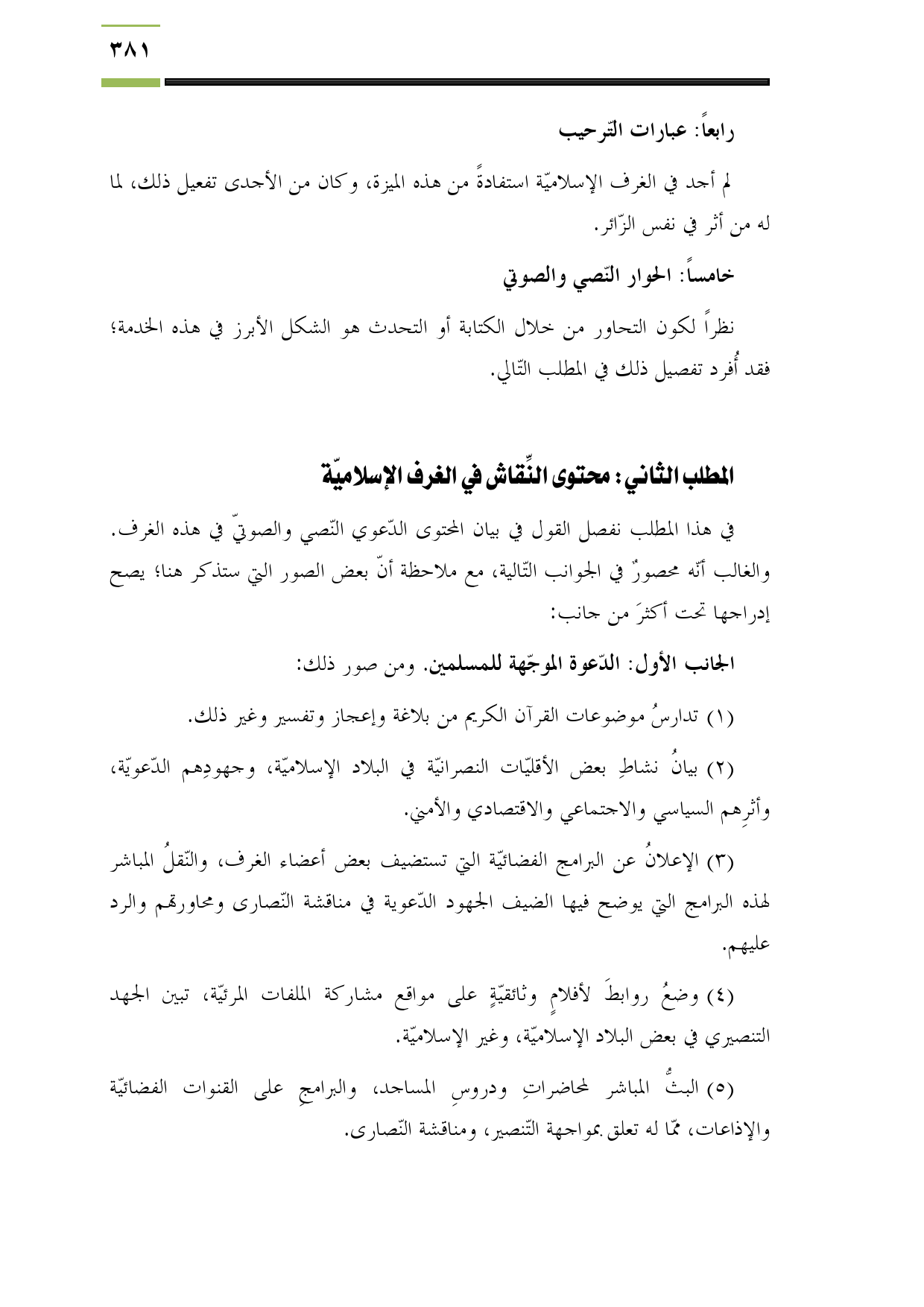 في هذا المطلب نفصل القول في بيان المحتوى الدّعوي النّصي والصوتيّ في هذه الغرف. والغالب أنّه محصورٌ في الجوانب التّالية، مع ملاحظة أنّ بعض الصور التي ستذكر هنا؛ يصح إدراجها تحت أكثرَ من جانب: