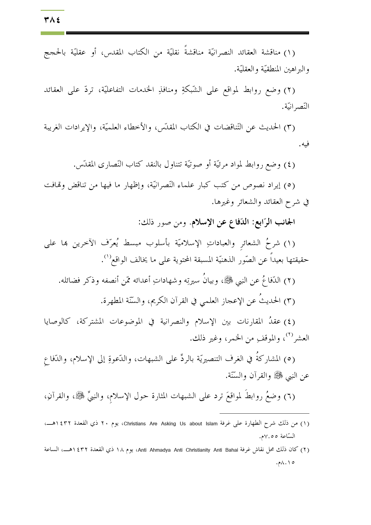 وضع روابط لمواقع على الشّبكةِ ومنافذِ الخدمات التفاعليّة، تردّ على العقائد النّصرانيّة.