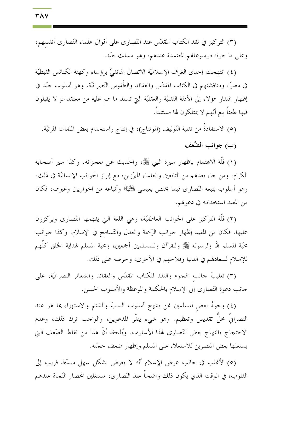 تغليبُ جانبِ الهجوم والنقد للكتاب المقدّس والعقائد والشعائر النصرانيّة، على جانب دعوة النّصارى إلى الإسلام بالحكمة والموعظة والأسلوب الحسن.