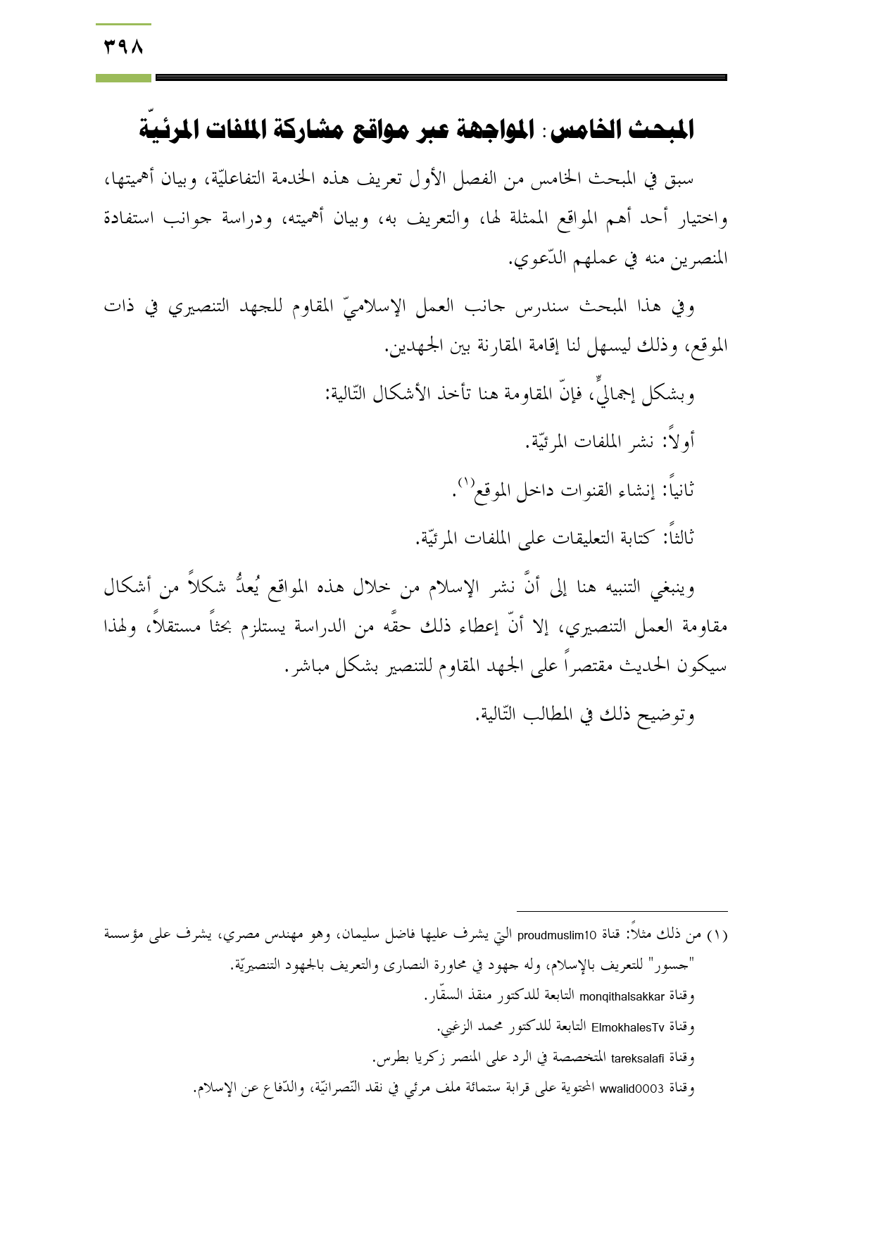 (¬1) من ذلك مثلاً: قناة proudmuslim10 التي يشرف عليها فاضل سليمان، وهو مهندس مصري، يشرف على مؤسسة "جسور" للتعريف بالإسلام، وله جهود في محاورة النصارى والتعريف بالجهود التنصيريّة.