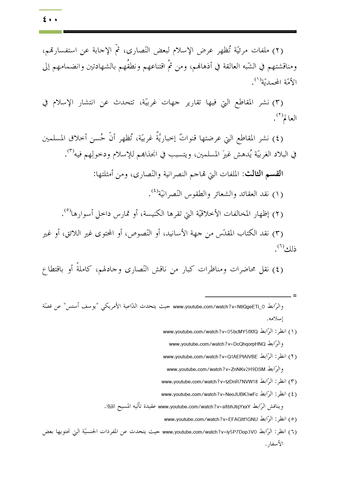 نشر المقاطع التي فيها تقارير جهات غربيّة، تتحدث عن انتشار الإسلام في العالم (¬2).