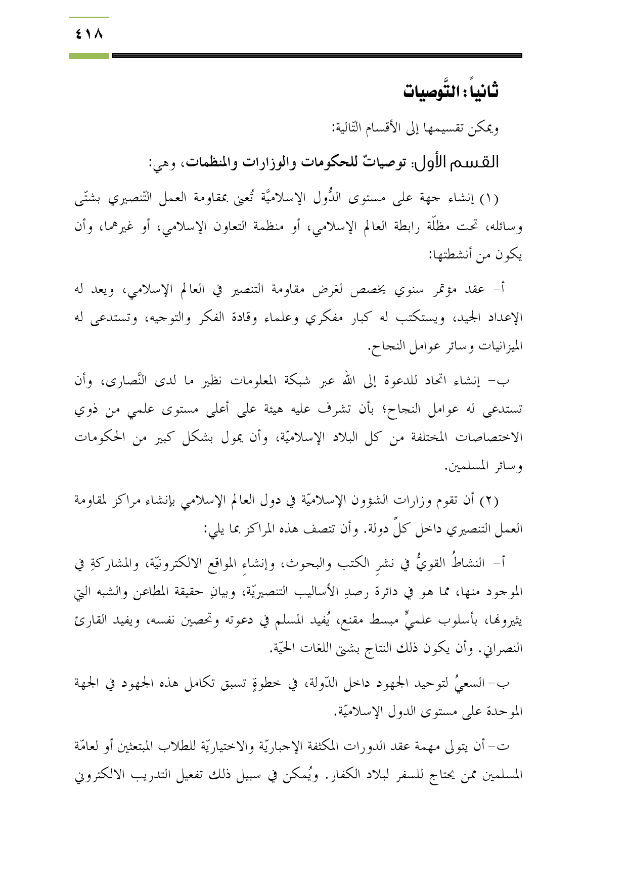 إنشاء جهة على مستوى الدُّول الإسلاميَّة تُعنى بمقاومة العمل التّنصيري بشتّى وسائله، تحت مظلّة رابطة العالم الإسلامي، أو منظمة التعاون الإسلامي، أو غيرهما، وأن يكون من أنشطتها:
