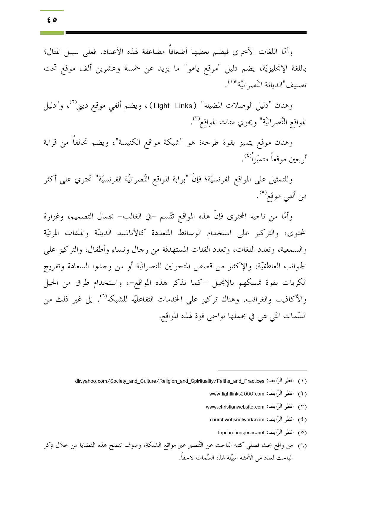 (¬6) من واقع بحث فصلي كتبه الباحث عن التَّنصير عبر مواقع الشبكة، وسوف تتضح هذه القضايا من خلال ذِكر الباحث لعدد من الأمثلة المبيِّنة لهذه السِّمات لاحقاً.