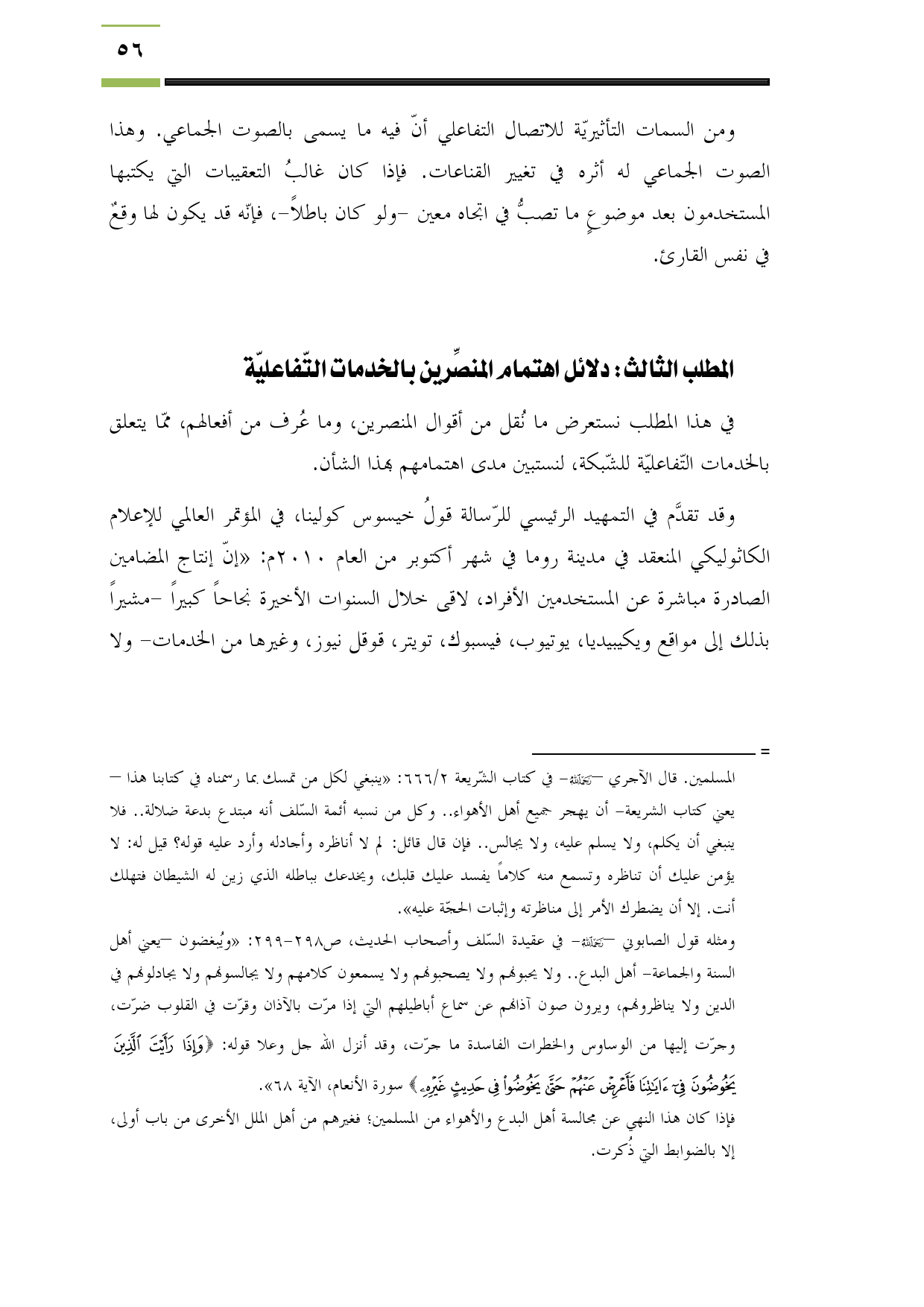 وقد تقدَّم في التمهيد الرئيسي للرّسالة قولُ خيسوس كولينا، في المؤتمر العالمي للإعلام الكاثوليكي المنعقد في مدينة روما في شهر أكتوبر من العام 2010م: «إنّ إنتاج المضامين الصادرة مباشرة عن المستخدمين الأفراد، لاقى خلال السنوات الأخيرة نجاحاً كبيراً -مشيراً بذلك إلى مواقع ويكيبيديا، يوتيوب، فيسبوك، تويتر، قوقل نيوز، وغيرها من الخدمات- ولا