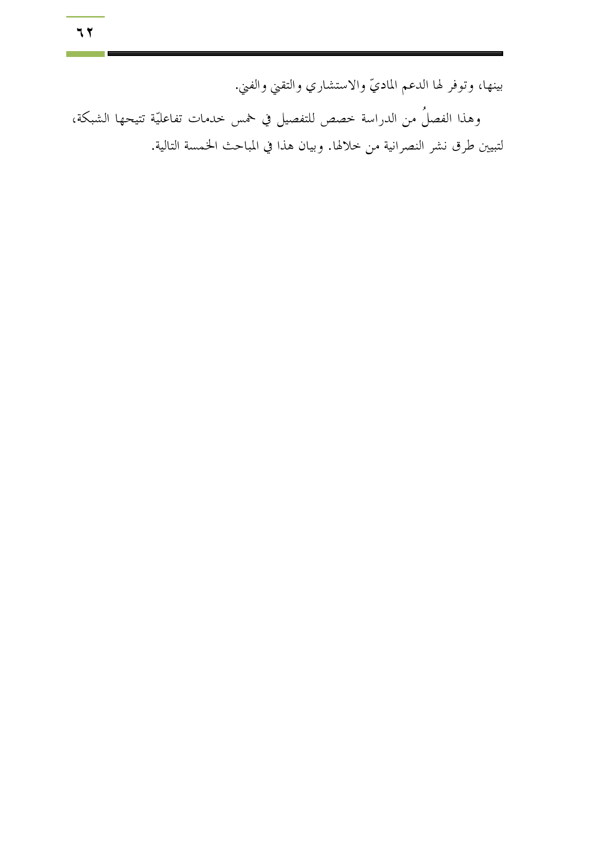 وهذا الفصلُ من الدراسة خصص للتفصيل في خمس خدمات تفاعليّة تتيحها الشبكة، لتبيين طرق نشر النصرانية من خلالها. وبيان هذا في المباحث الخمسة التالية.