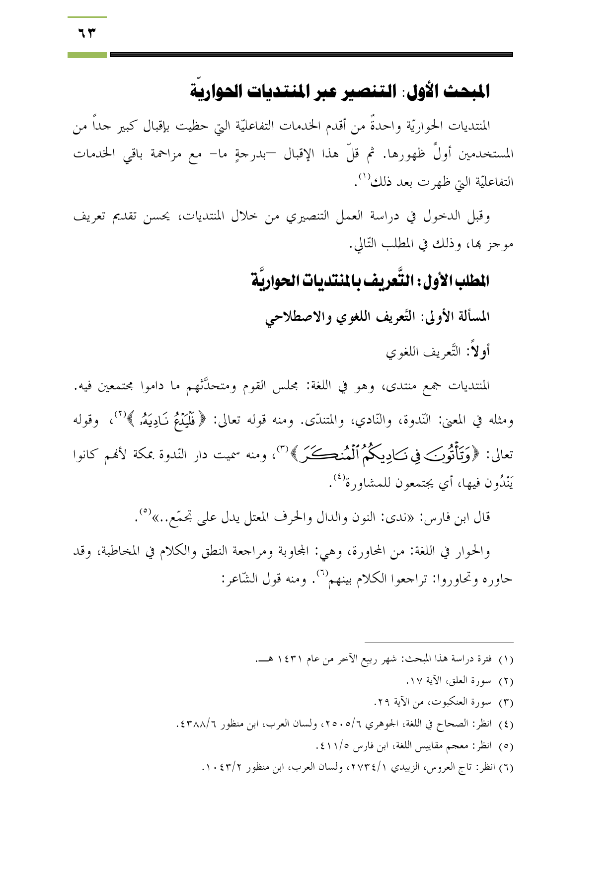 المنتديات جمع منتدى، وهو في اللغة: مجلس القوم ومتحدَّثهم ما داموا مجتمعين فيه. ومثله في المعنى: النّدوة، والنّادي، والمتندّى. ومنه قوله تعالى: {فَلْيَدْعُ نَادِيَهُ} (¬2)، وقوله تعالى: {وَتَأْتُونَ فِي نَادِيكُمُ الْمُنْكَرَ} (¬3)، ومنه سميت دار النّدوة بمكة لأنهم كانوا يَنْدُون فيها، أي يجتمعون للمشاورة (¬4).