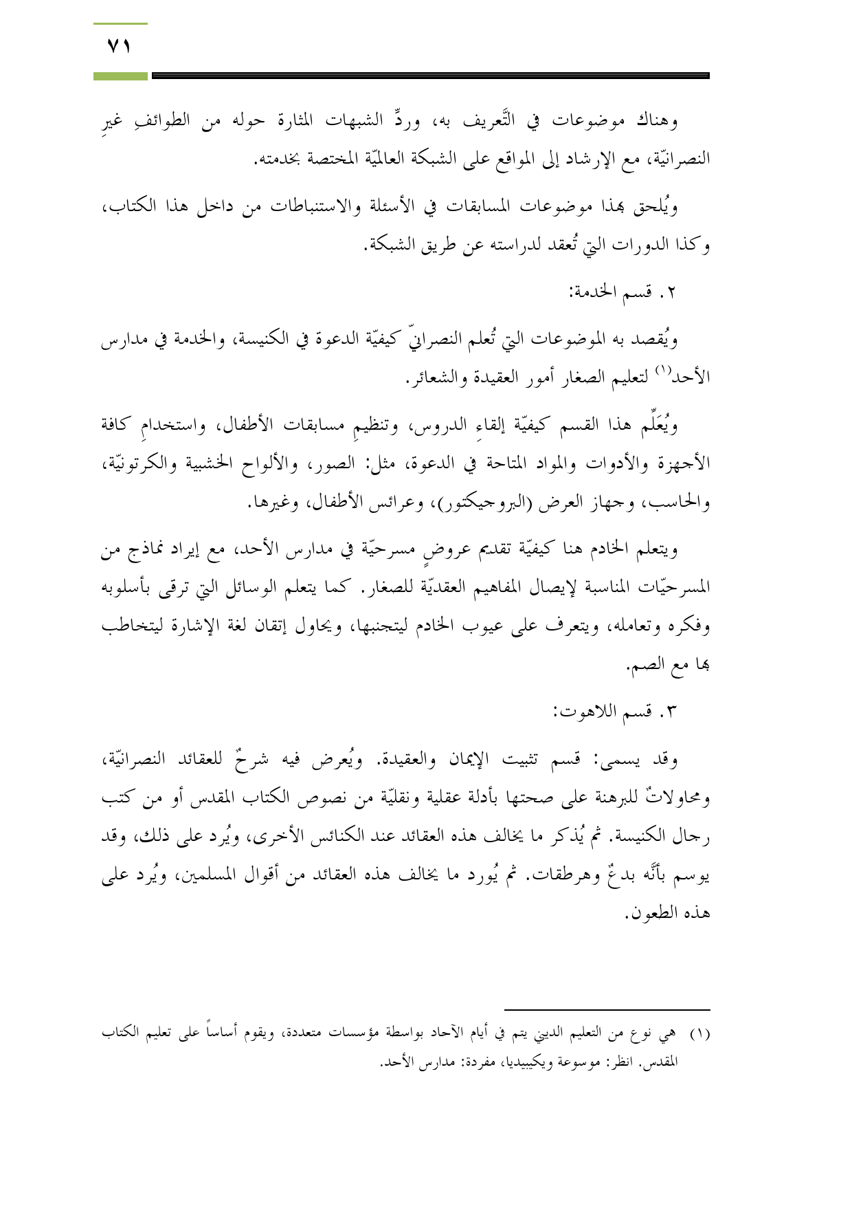 (¬1) هي نوع من التعليم الديني يتم في أيام الآحاد بواسطة مؤسسات متعددة، ويقوم أساساً على تعليم الكتاب المقدس. انظر: موسوعة ويكيبيديا، مفردة: مدارس الأحد.