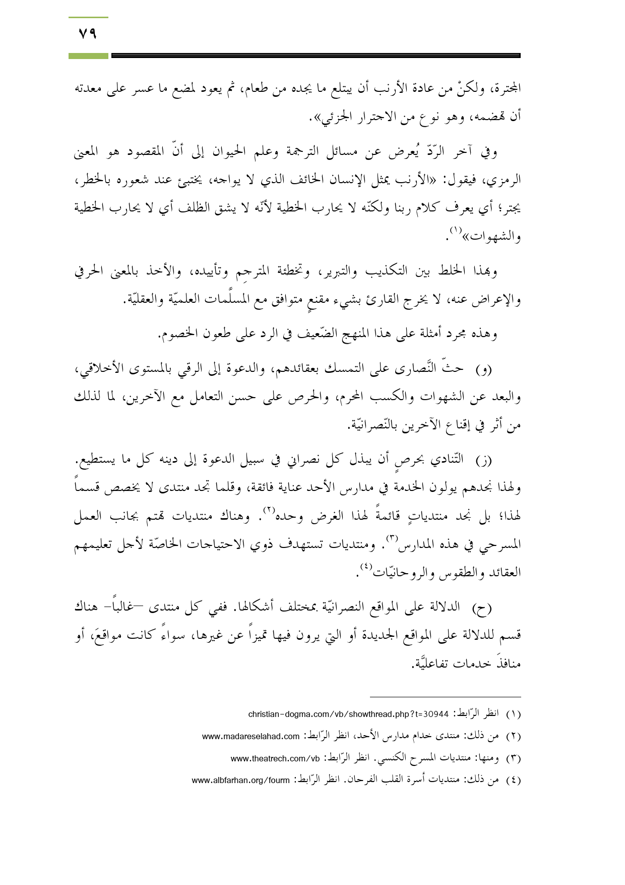 (ح) الدلالة على المواقع النصرانيّة بمختلف أشكالها. ففي كل منتدى -غالباً- هناك قسم للدلالة على المواقع الجديدة أو التي يرون فيها تميزاً عن غيرها، سواءً كانت مواقعَ، أو منافذَ خدمات تفاعليَّة.