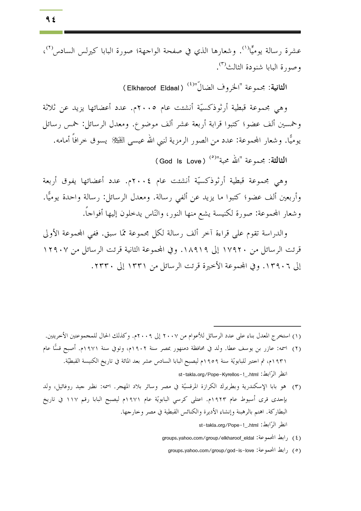 وهي مجموعة قبطية أرثوذكسية أنشئت عام 2006م. عدد أعضائها يقرب من ستة عشر ألف عضو؛ كتبوا ما يقرب من تسعة عشر ألف موضوع. ومعدل الرسائل: ثلاث عشرة رسالة يوميٍّا (¬1). وشعارها الذي في صفحة الواجهة؛ صورة البابا كيرلس السادس (¬2)، وصورة البابا شنودة الثالث (¬3).