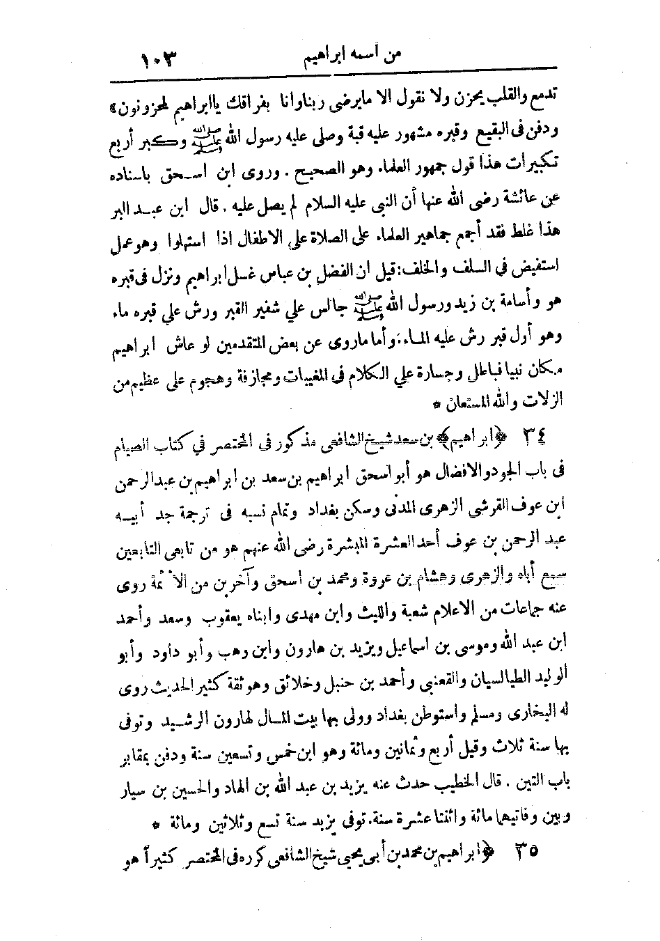وروى ابن إسحاق بإسناده، عن عائشة، رضى الله عنه، أن النبى - صَلَّى اللهُ عَلَيْهِ وَسَلَّمَ - لم يصل عليه. قال ابن عبد البر: هذا غلط، فقد أجمع جماهير العلماء على الصلاة على الأطفال إذا استهلوا، وهو عمل استفيض فى السلف والخلف. قيل: إن الفضل بن عباس غسل إبراهيم، ونزل فى قبره هو وأسامة بن زيد، ورسول الله - صَلَّى اللهُ عَلَيْهِ وَسَلَّمَ - جالس على شفير القبر، ورش على قبره ماء، وهو أول قبر رش عليه الماء. وأما ما روى عن بعض المتقدمين: لو عاش إبراهيم لكان نبيًا، فباطل وجسارة على الكلام فى المغيبات، ومجازفة، وهجوم على عظيم من الزلات، والله المستعان.