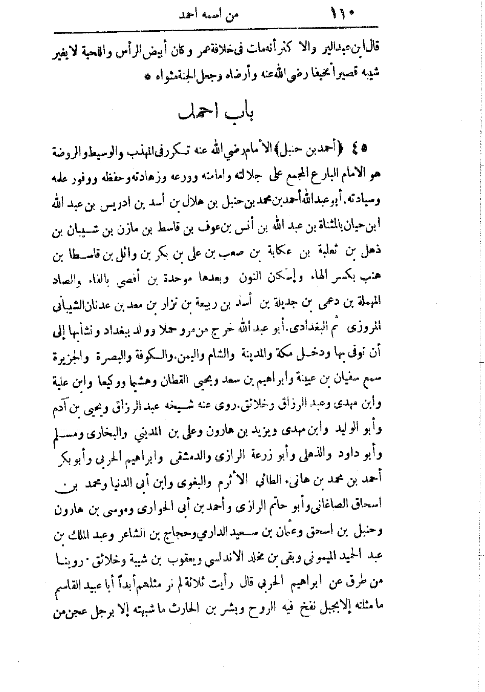 تكرر فى المهذب، والوسيط، والروضة، هو الإمام البارع، المجمع على جلالته، وإمامته، وورعه، وزهادته، وحفظه، ووفور علمه، وسيادته، أبو عبد الله أحمد بن محمد ابن حنبل بن هلال بن أسد بن إدريس بن عبد الله بن حيان، بالمثناة، ابن عبد الله بن أنس بن عوف بن قاسط بن مازن بن شيبان بن ذهل بن ثعلبة بن عكابة بن صعب بن على بن بكر بن وائل بن قاسطا بن هنب، بكسر الهاء وإسكان النون وبعدها موحدة، ابن أفصى، بالفاء والصاد المهملة، ابن دعمى بن جديلة بن أسد بن ربيعة بن نزار بن معد بن عدنان الشيبانى المروزى ثم البغدادى، أبو عبد الله.