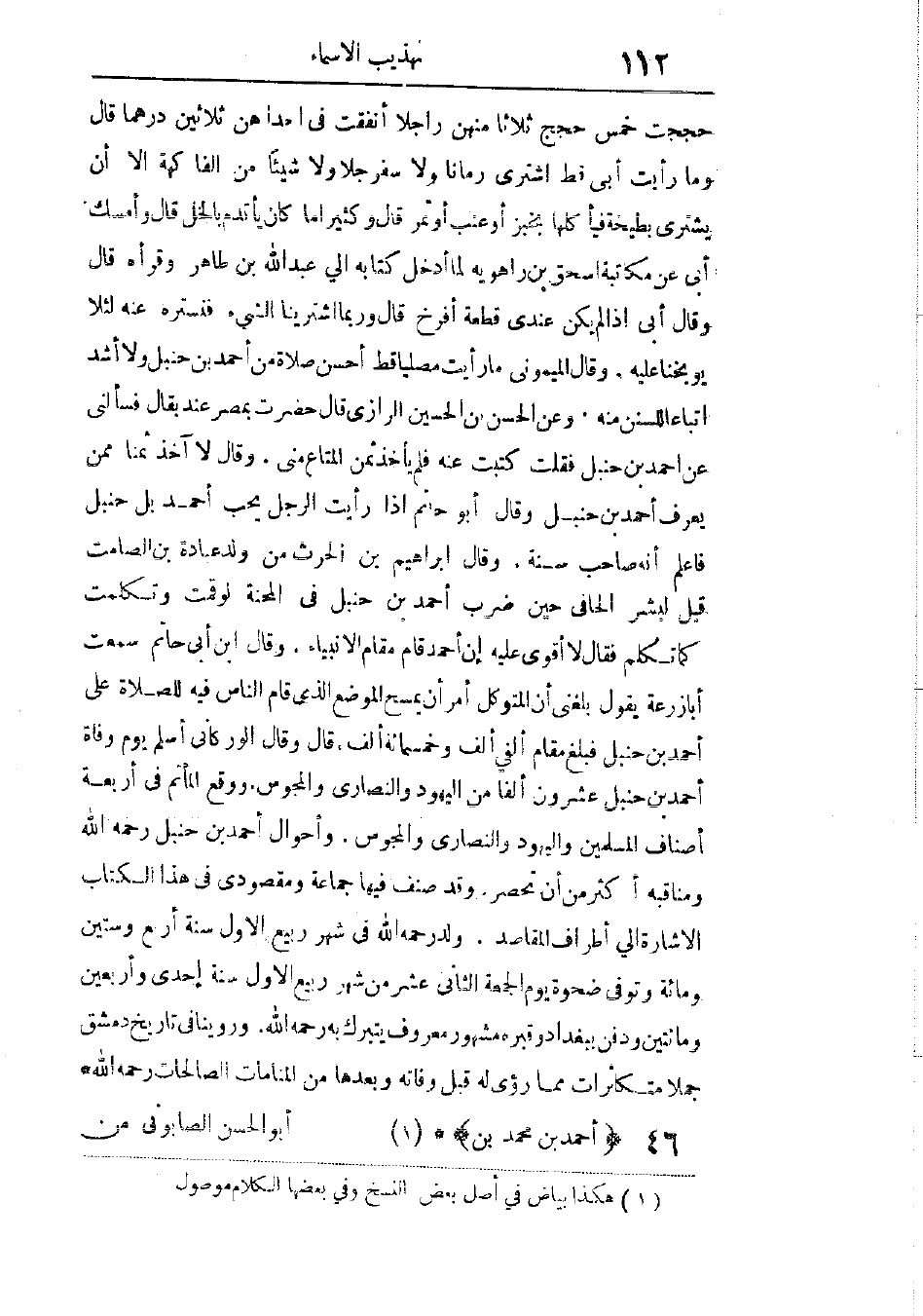وأحوال أحمد بن حنبل، رحمه الله، ومناقبه أكثر من أن تحصر، وقد صنف فيها جماعة، ومقصودى فى هذا الكتاب الإشارة إلى أطراف المقاصد. ولد، رحمه الله، فى شهر ربيع الأول سنة أربع وستين ومائة، وتوفى ضحوة يوم الجمعة الثانى عشر من شهر ربيع الأول سنة إحدى وأربعين ومائتين، ودفن ببغداد، وقبره مشهور معروف يتبرك به، رحمه الله. وروينا فى تاريخ دمشق جُملاً متكاثرات مما رؤى له قبل وفاته وبعدها من المنامات الصالحات، رحمه الله.