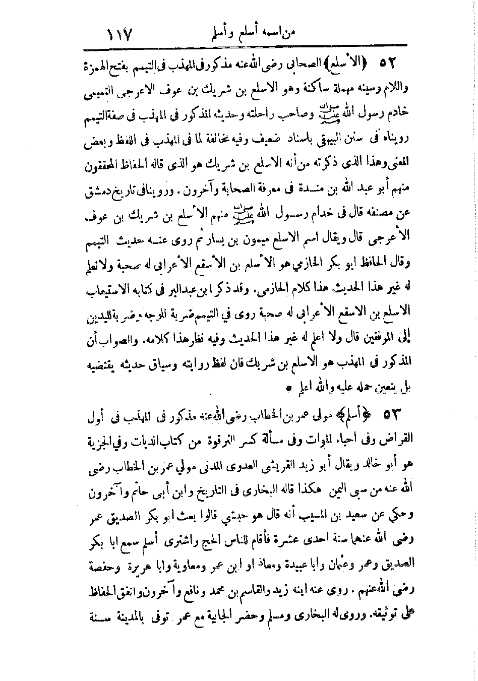 مذكور فى المهذب فى التيمم، بفتح الهمزة واللام، وسينه مهملة ساكنة، وهو الأسلع بن شريك بن عوف الأعرجى التميمى، خادم رسول الله - صَلَّى اللهُ عَلَيْهِ وَسَلَّمَ -، وصاحب راحلته، وحديثه مذكور فى المهذب فى صفة التيمم، رويناه فى سنن البيهقى بإسناد ضعيف، وفيه مخالفة لما فى المهذب فى اللفظ وبعض المعنى، وهذا الذى ذكرته من أنه الأسلع بن شريك هو الذى قاله الحفاظ المحققون، منهم أبو عبد الله بن مندة فى معرفة الصحابة، وآخرون.