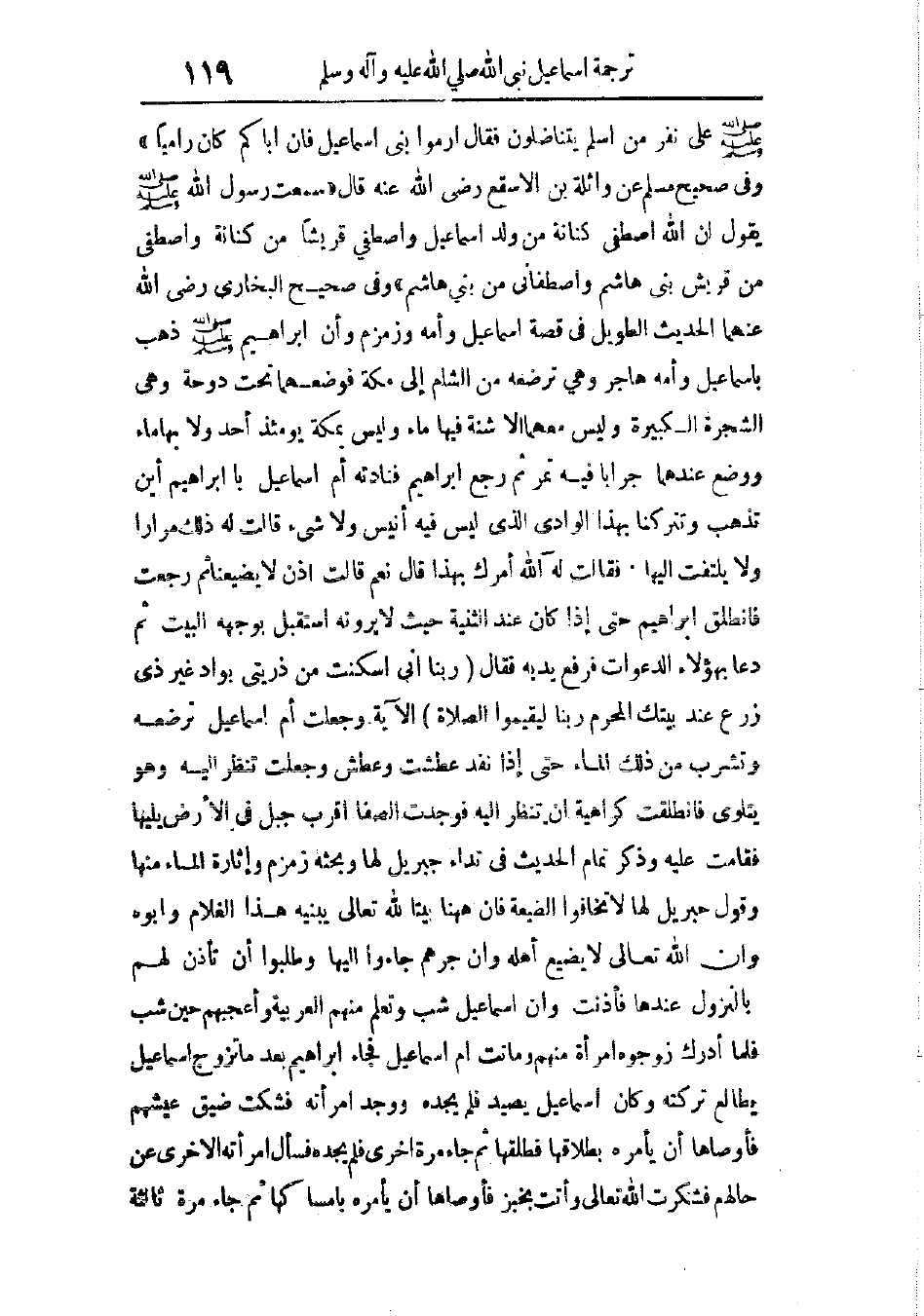 وفى صحيح البخارى، رضى الله عنه، الحديث الطويل فى قصة إسماعيل وأمه وزمزم، وأن إبراهيم، عليه السلام، ذهب بإسماعيل وأمه هاجر وهى ترضعه من الشام إلى مكة، فوضعهما تحت دوحة، وهى الشجرة الكبيرة، وليس معهما إلا شنة فيها ماء، وليس بمكة يومئذ أحد، ولا بها ماء، ووضع عندهما جرابًا فيه تمر، ثم رجع إبراهيم فنادته أم إسماعيل: يا إبراهيم، أين تذهب وتتركنا بهذا الوادى الذى ليس فيه أنيس ولا شىء؟ قالت له ذلك مرارًا ولا يلتفت إليها، فقالت له: آالله أمرك بهذا؟ قال: نعم، قالت: إذًا لا يضيعنا، ثم رجعت، فانطلق إبراهيم، حتى إذا كان عند الثنية حيث لا يرونه استقبل بوجهه البيت، ثم دعا بهؤلاء الدعوات، فرفع يديه فقال: {رَّبَّنَا إِنِّى أَسْكَنتُ مِن ذُرِّيَّتِى بِوَادٍ غَيْرِ ذِى زَرْعٍ عِندَ بَيْتِكَ الْمُحَرَّمِ رَبَّنَا لِيُقِيمُوا الصَّلاَةَ} [إبراهيم: 37] الآية.