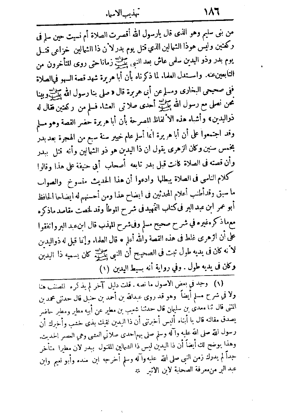 وأشباه هذه الألفاظ المصرحة بأن أبا هريرة حضر القصة وهو مسلم. وقد اجتمعوا على أن أبا هريرة إنما أسلم عام خيبر سنة سبع من الهجرة بعد بدر بخمس سنين، وكان الزهرى يقول: إن ذا اليدين هو ذو الشمالين، وأنه قُتل ببدر، وأن قصته فى الصلاة كانت قبل بدر، تابعه أصحاب أبى حنيفة على هذا، وقالوا: كلام الناس فى الصلاة يبطلها، وادعوا أن هذا الحديث منسوخ، والصواب ما سبق.
