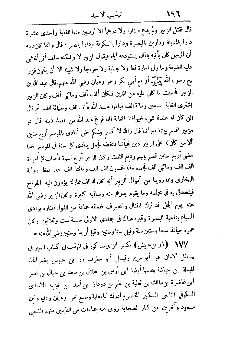 بكسر الزاى. مذكور فى المهذب فى كتاب السير فى مسائل الأمان. هو أبو مريم، وقيل: أبو مطرف زر بن حبيش، بضم الحاء المهملة، ابن حباشة، بضمها أيضًا، ابن أوس بن هلال بن سعد بن حبال بن نصر بن غاضرة بن مالك بن ثعلبة بن غنم بن دودان بن أسد بن خزيمة الأسدى الكوفى التابعى الكبير المخضرم.
