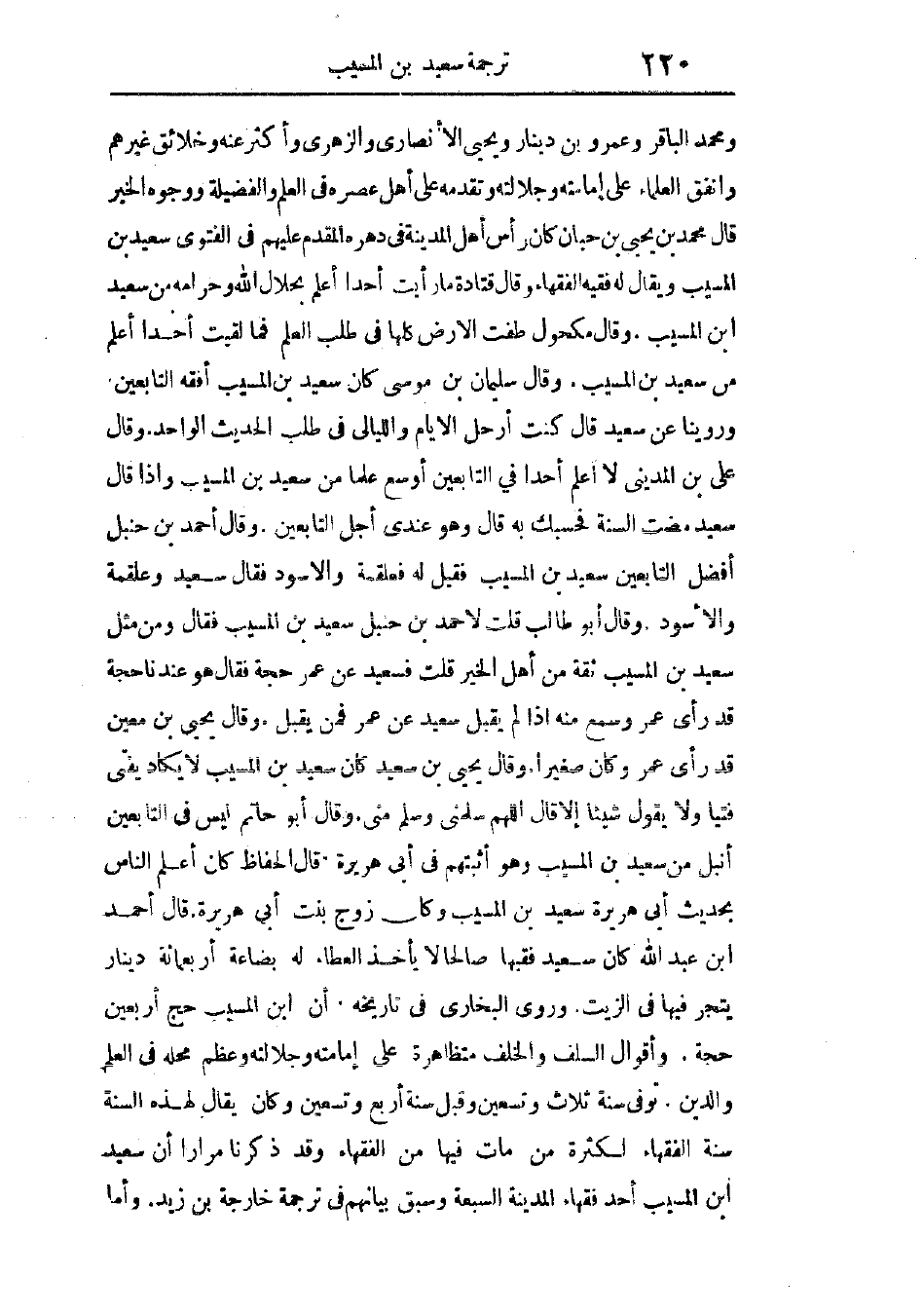 وقال أبو حاتم: ليس فى التابعين أنبل من سعيد بن المسيب، وهو أثبتهم فى أبى هريرة. قال الحافظ: كان أعلم الناس بحديث أبى هريرة سعيد بن المسيب، وكان زوج بنت أبى هريرة. قال أحمد بن عبد الله: كان سعيد فقيهًا، صالحًا، لا يأخذ العطاء، له بضاعة أربعمائة دينار يتجر فيها فى الزيت. وروى البخارى فى تاريخه أن ابن المسيب حج أربعين حجة. وأقوال السلف والخلف متظاهرة على إمامته، وجلالته، وعظم محله فى العلم والدين.