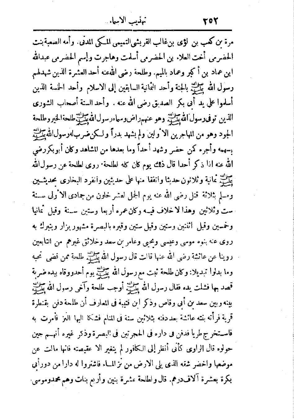 رُوى لطلحة عن رسول الله - صَلَّى اللهُ عَلَيْهِ وَسَلَّمَ - ثمانية وثلاثون حديثًا، واتفقا منها على حديثين، وانفرد البخارى بحديثين، ومسلم بثلاثة، قُتل، رضى الله عنه، يوم الجمل لعشر خلون من جمادى الأولى سنة ست وثلاثين، وهذا لا خلاف فيه، وكان عمره أربعًا وستين سنة، وقيل: ثمانيًا وخمسين، وقيل: اثنتين وستين، وقيل: ستين، وقبره بالبصرة مشهور يزار ويتبرك به. روى عنه بنوه موسى، وعيسى، ويحيى، وعامر بن سعد، وخلائق غيرهم من التابعين.