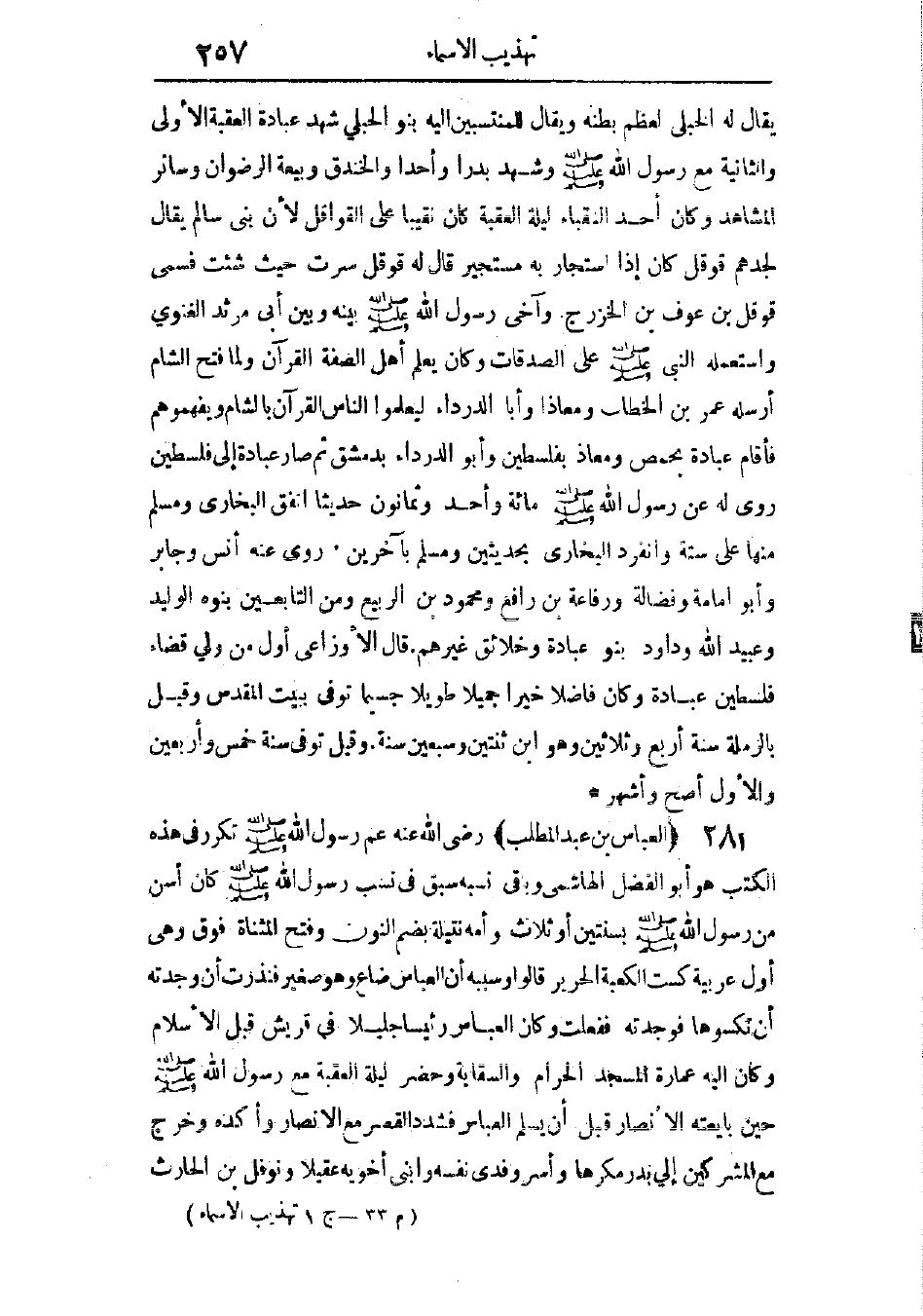 عم رسول الله - صَلَّى اللهُ عَلَيْهِ وَسَلَّمَ -. تكرر فى هذه الكتب. هو أبو الفضل الهاشمى، وباقى نسبه سبق فى نسب رسول الله - صَلَّى اللهُ عَلَيْهِ وَسَلَّمَ -، كان أسن من رسول الله - صَلَّى اللهُ عَلَيْهِ وَسَلَّمَ - بسنتين أو ثلاث، وأمه نتيلة، بضم النون وفتح المثناة فوق، وهى أول عربية كست الكعبة الحرير. قالوا: وسببه أن العباس ضاع وهو صغير، فنذرت إن وجدته أن تكسوها، فوجدته ففعلت، وكان العباس رئيسًا جليلاً فى قريش قبل الإسلام، وكان إليه عمارة المسجد الحرام والسقاية، وحضر ليلة العقبة مع رسول الله - صَلَّى اللهُ عَلَيْهِ وَسَلَّمَ - حين بايعته الأنصار قبل أن يُسلم العباس، فشدد القصر مع الأنصار وأكده.