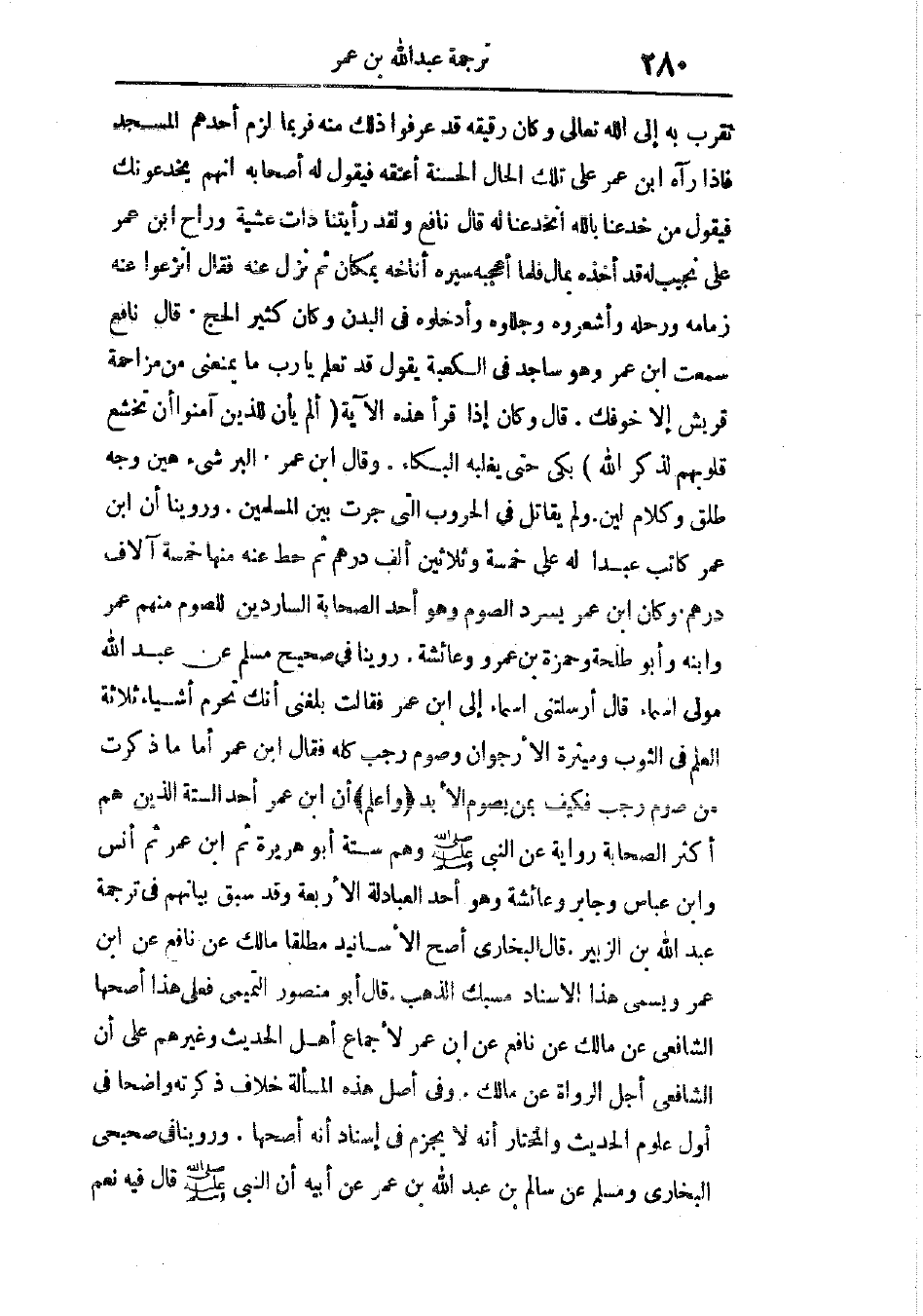واعلم أن ابن عمر أحد الستة الذين هم أكثر الصحابة رواية عن النبى - صَلَّى اللهُ عَلَيْهِ وَسَلَّمَ -، وهم ستة: أبو هريرة، ثم ابن عمر، ثم أنس، وابن عباس، وجابر، وعائشة، وهو أحد العبادلة الأربعة، وقد سبق بيانهم فى ترجمة عبد الله بن الزبير. قال البخارى: أصح الأسانيد مطلقًا مالك، عن نافع، عن ابن عمر، ويسمى هذا الإسناد مسبك الذهب. قال أبو منصور التميمى: فعلى هذا أصحها الشافعى عن مالك، عن نافع، عن ابن عمر لإجماع أهل الحديث وغيرهم على أن الشافعى أجلّ الرواة عن مالك، وفى أصل هذه المسألة خلاف ذكرته واضحًا فى أول علوم الحديث، والمختار أنه لا يجزم فى إسناد أنه أصحها.