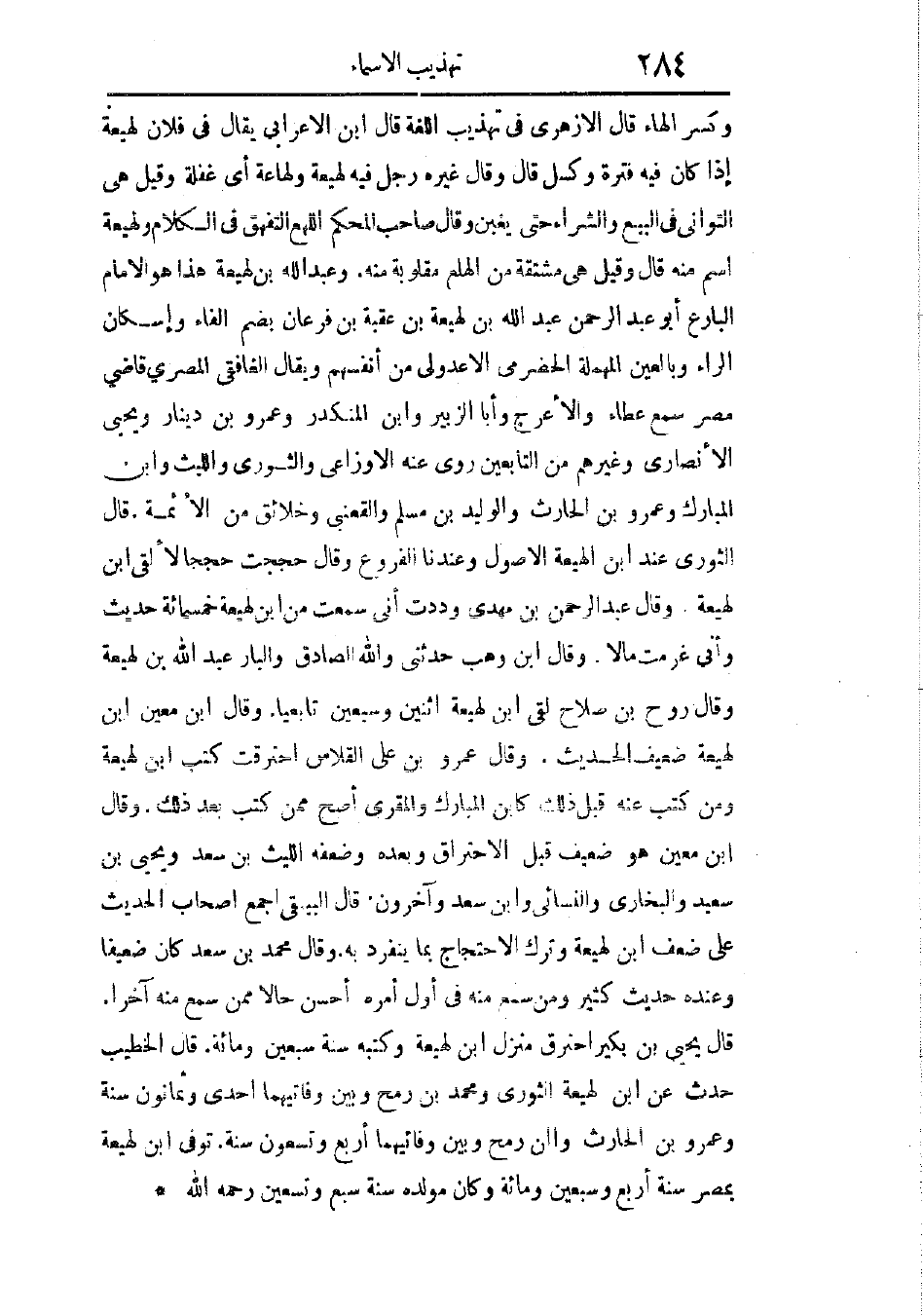 وقال محمد بن سعد: كان ضعيفًا، وعنده حديث كثير، ومن سمع منه فى أول أمره أحسن حالاً ممن سمع منه آخرًا. قال يحيى بن بكير: احترق منزل ابن لهيعة وكتبه سنة سبعين ومائة قال الخطيب: حدث عن ابن لهيعة: الثورى، ومحمد بن رمح، وبين وفاتيهما إحدى وثمانون سنة، وعمرو بن الحارث، وابن رمح، وبين وفاتيهما أربع وتسعون سنة. توفى ابن لهيعة بمصر سنة أربع وسبعين ومائة، وكان مولده سنة سبع وتسعين، رحمه الله.