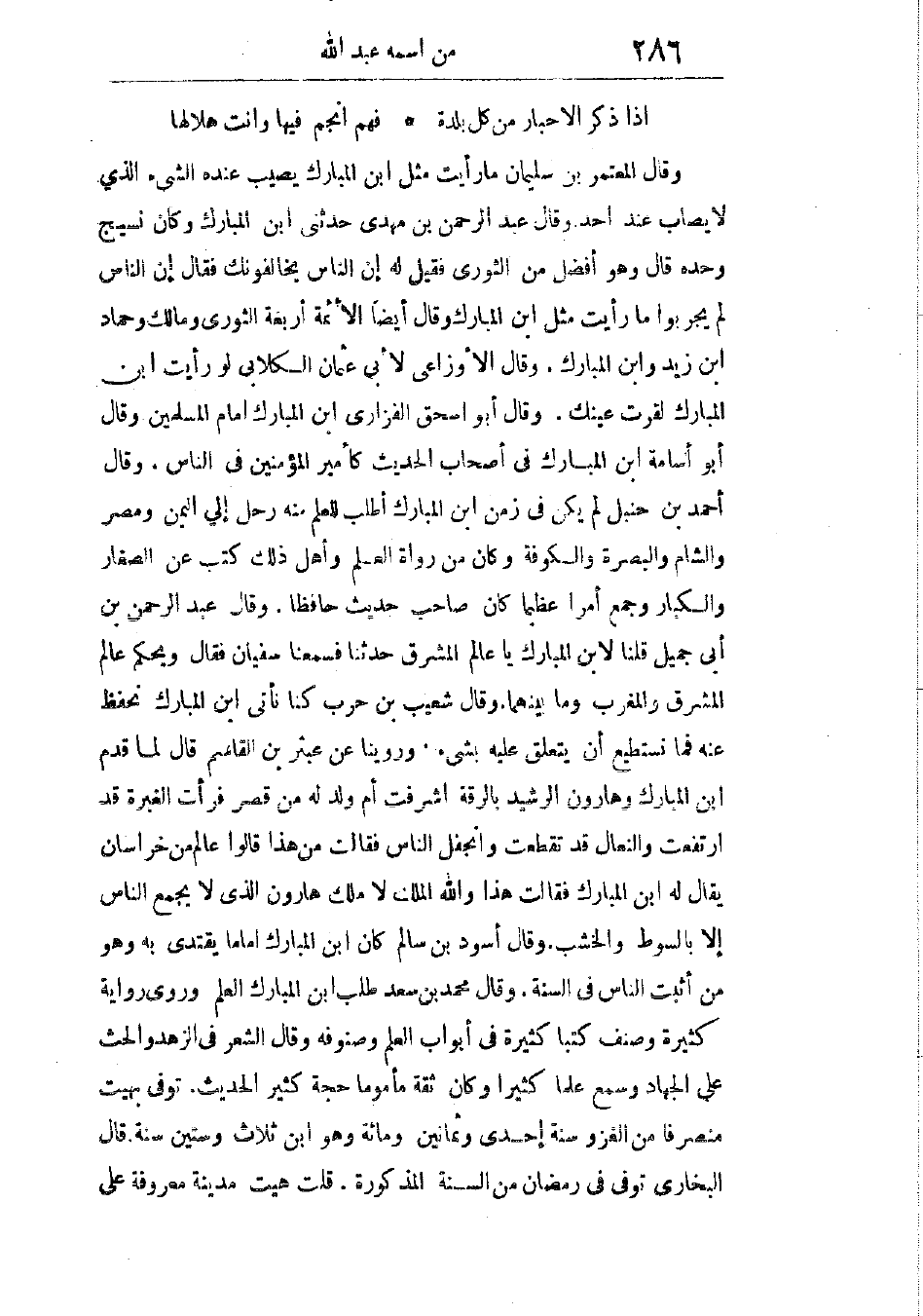 وقال أسود بن سالم: كان ابن المبارك إمامًا يقتدى به، وهو من اثبت الناس فى السنة. وقال محمد بن سعد: طلب ابن المبارك العلم، وروى رواية كثيرة، وصنف كتبًا كثيرة فى أبواب العلم وصنوفه، وقال الشعر فى الزهد والحث على الجهاد، وسمع علمًا كثيرًا، وكان ثقة، مأمونًا، حجة، كثير الحديث.
