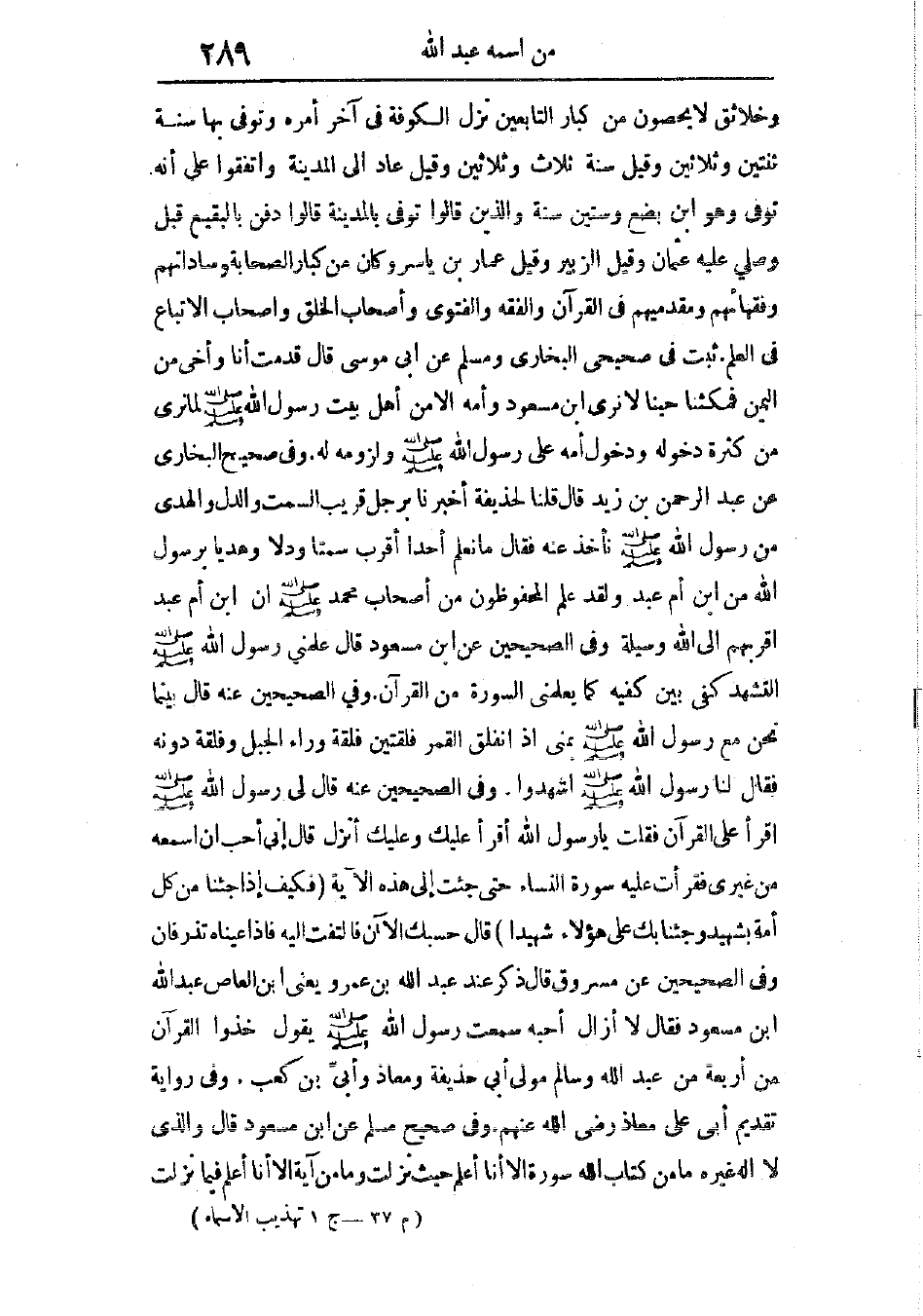 وفى الصحيحين عن ابن مسعود، قال: علمنى رسول الله - صَلَّى اللهُ عَلَيْهِ وَسَلَّمَ - التشهد كفى بين كفيه كما يعلمنى السورة من القرآن. وفى الصحيحين عنه، قال: بينما نحن مع رسول الله - صَلَّى اللهُ عَلَيْهِ وَسَلَّمَ - بمنى، إذا انفلق القمر فلقتين، فلقة وراء الجبل، وفلقة دونه، فقال لنا رسول الله - صَلَّى اللهُ عَلَيْهِ وَسَلَّمَ -: “اشهدوا”.