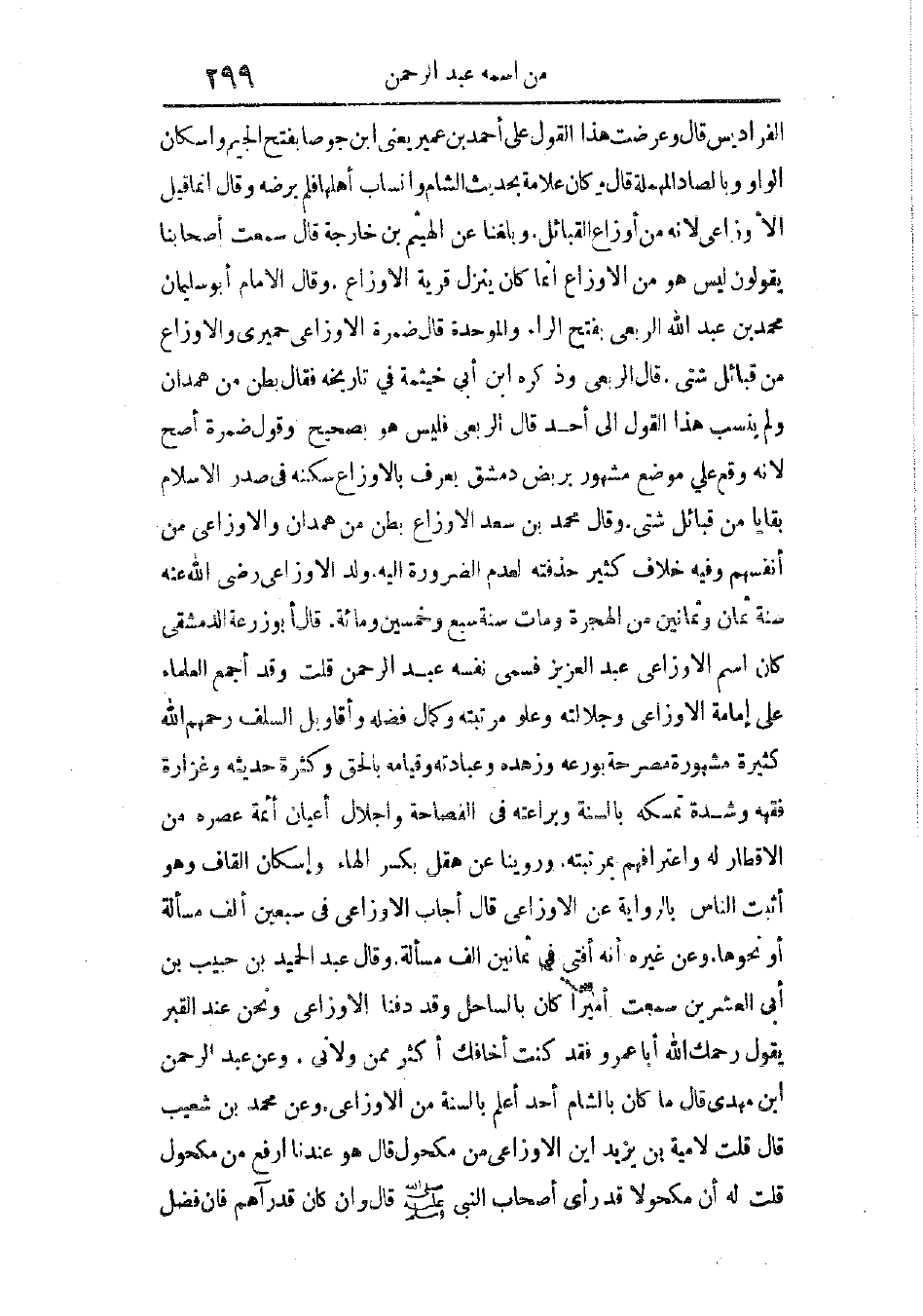 وبلغنا عن الهيثم بن خارجة، قال: سمعت أصحابنا يقولون: ليس هو من الأوزاع، إنما كان ينزل قرية الأوزاع. وقال الإمام أبو سليمان محمد بن عبد الله الربعى، بفتح الراء والموحدة: قال ضمرة: الأوزاعى حميرى، والأوزاع من قبائل شتى. قال الربعى: وذكره ابن أبى خيثمة فى تاريخه، فقال: بطن من همدان، ولم ينسب هذا القول إلى أحد. قال الربعى: فليس هو بصحيح، وقول ضمرة أصح؛ لأنه وقع على موضع مشهور بربض دمشق يُعرف بالأوزاع، سكنه فى صدر الإسلام بقايا من قبائل شتى. وقال محمد ابن سعد: الأوزاع بطن من همدان، والأوزاعى من أنفسهم، وفيه خلاف كثير حذفته لعدم الضرورة إليه.