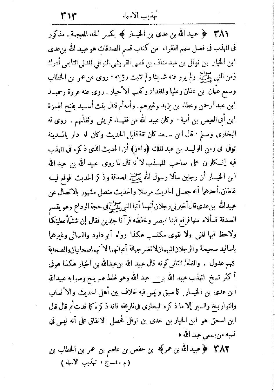 والغلط الثانى: كونه قال: عبيد الله بن عبد الله بن الخيار، هكذا هو فى أكثر نسخ المهذب: عبيد الله بن عبد الله، وهو غلط صريح، وصوابه: عبيد الله بن عدى بن الخيار، كما سبق، وليس فيه خلاف بين أهل الحديث والأنساب والتواريخ والسير، إلا ما ذكره البخارى فى تاريخه، فإنه ذكره كما قدمته، ثم قال: قال ابن إسحاق: هو ابن الخيار بن عدى بن نوفل، فحصل الاتفاق على أنه ليس فى نسبه من يسمى عبد الله.