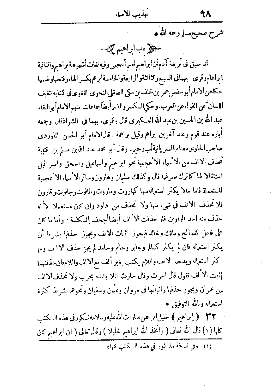 وقال أبو محمد عبد الله بن مسلم بن قتيبة: تحذف الألف من الأسماء الأعجمية نحو إبراهيم، وإسماعيل، وإسحاق، وإسرائيل، استثقالاً لها، كما ترك صرفها. قال: وكذلك سليمان، وهارون، وسائر الأسماء الأعجمية المستعملة، فأما ما لا يكثر استعماله منها كهاروت، وماروت، وطالوت، وجالوت، وقارون، فلا تحذف الألف فى شىء منها، ولا تحذف من داود، وإن كان مستعملاً؛ لأنه حذف منه أحد الواوين، فلو حذفت الألف أيضًا أجحف بالكلمة، وأما ما كان على فاعل كصالح، ومالك، وخالد، فيجوز إثبات الألف، ويجوز حذفها بشرط أن يكثر استعماله، فإن لم يكثر كسالم، وجابر، وحاتم، وحامد، لم يجز حذف الألف، ومما كثر استعماله ويدخله الألف واللام يكتب بغير ألف مع الألف واللام، فإن حذفتهما أثبت الألف، تقول: قال الحارث، وقال: حارث؛ لئلا يشتبه بحرب، ولا تحذف الألف من عمران، ويجوز حذفها وإثباتها فى مروان، وعثمان، وسفيان، ونحوهم بشرط كثرة استعماله، وبالله التوفيق.