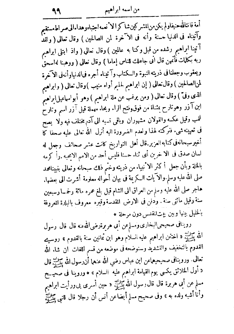 وروينا فى صحيحيهما، عن ابن عباس، رضى الله عنهما، أن رسول الله - صَلَّى اللهُ عَلَيْهِ وَسَلَّمَ - قال: “أول الخلائق يكسى يوم القيامة إبراهيم، عليه السلام” (¬2) . وروينا فى صحيح مسلم، عن أبى هريرة، قال: قال رسول الله - صَلَّى اللهُ عَلَيْهِ وَسَلَّمَ -: “حين أسرى بى ورأيت إبراهيم، وأنا أشبه ولده به” (¬3) .