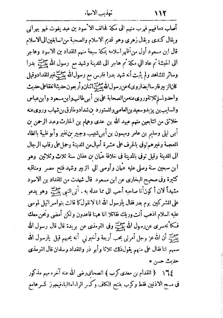 وفى صحيح البخارى، عن ابن مسعود، قال: شهدت من المقداد بن الأسود مشهدًا لأن أكون أنا صاحبه أحب إلىَّ مما عدله به، أتى النبى - صَلَّى اللهُ عَلَيْهِ وَسَلَّمَ - وهو يدعو على المشركين يوم بدر، فقال: يا رسول الله، إنا لا نقول كما قالت بنو إسرائيل لموسى، عليه السلام: {اذْهَبْ أَنتَ وَرَبُّكَ فَقَاتِلا إِنَّا هَاهُنَا قَاعِدُونَ} [المائدة: 24] ، ولكن امضى ونحن معك، فكأنه سرى عن رسول الله - صَلَّى اللهُ عَلَيْهِ وَسَلَّمَ -.
