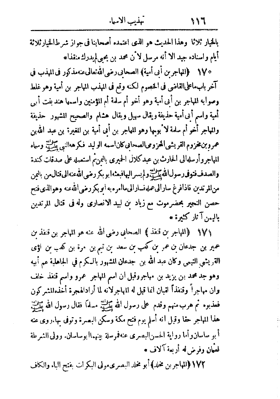 مذكور فى المهذب فى آخر باب ما على القاضى فى الخصوم، لكنه وقع فى المهذب: المهاجر بن أمية، وهو غلط، وصوابه: المهاجر بن أبى أمية، وهو أخو أم سلمة أم المؤمنين، واسمها هند بنت أبى أمية، واسم أبى أمية حذيفة، ويقال: سهيل، ويقال: هشام، والصحيح المشهور حذيفة، والمهاجر أخو أم سلمة لأبويها.