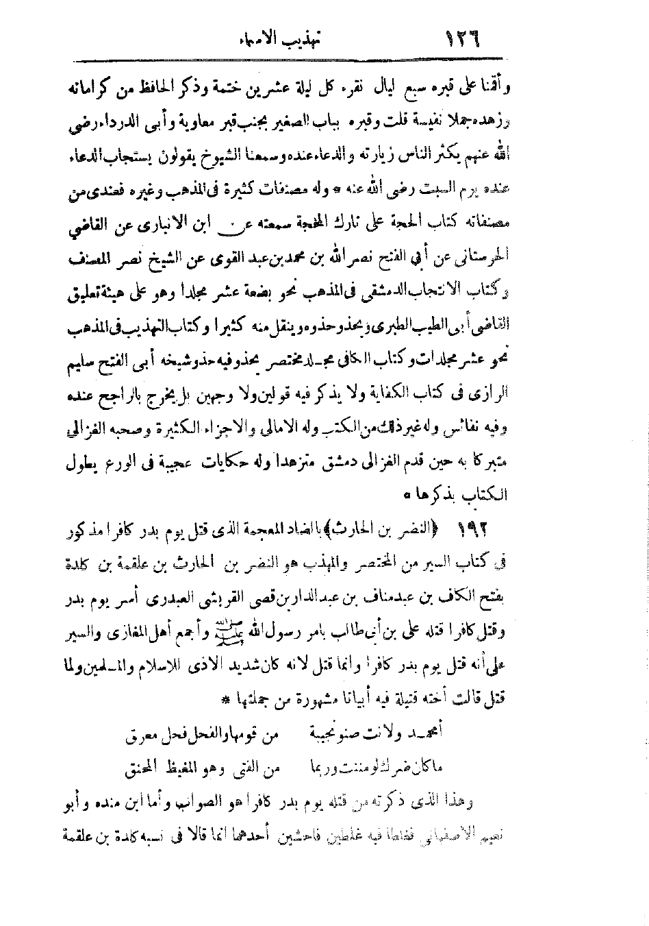 بالضاد المعجمة، الذى قُتل يوم بدر كافرًا، مذكور فى كتاب السير من المختصر والمهذب. هو النضر بن الحارث بن علقمة بن كلدة، بفتح الكاف، ابن عبد مناف بن عبد الدار بن قصى القريشى العبدرى، أُسر يوم بدر، وقُتل كافرًا، قَتله على بن أبى طالب بأمر رسول الله - صَلَّى اللهُ عَلَيْهِ وَسَلَّمَ -، وأجمع أهل المغازى والسير على أنه قُتل يوم بدر كافرًا، وإنما قتل لأنه كان شديد الأذى للإسلام والمسلمين، ولما قُتل قالت أخته قتيلة فيه أبياتًا مشهورة من جملتها: